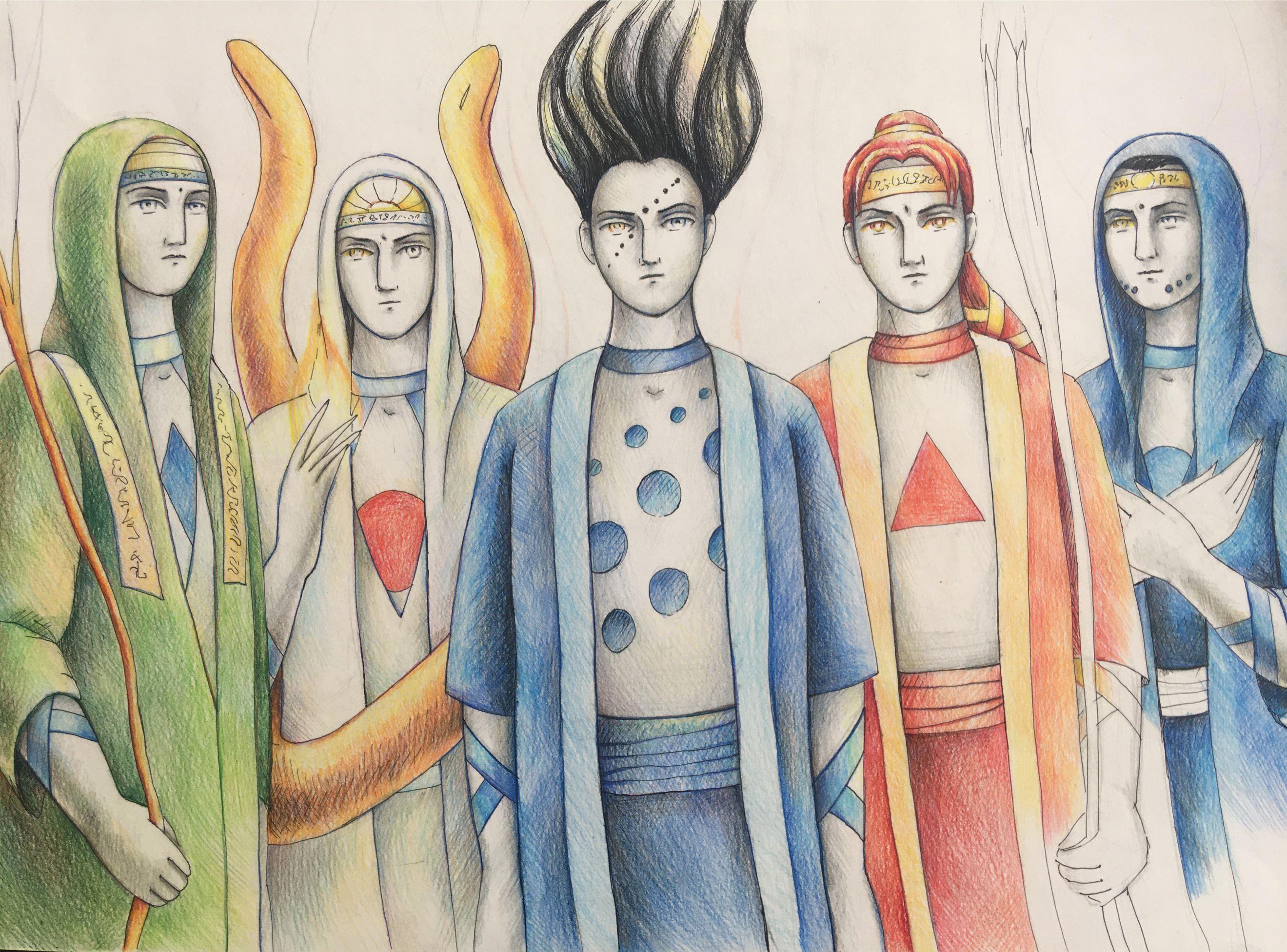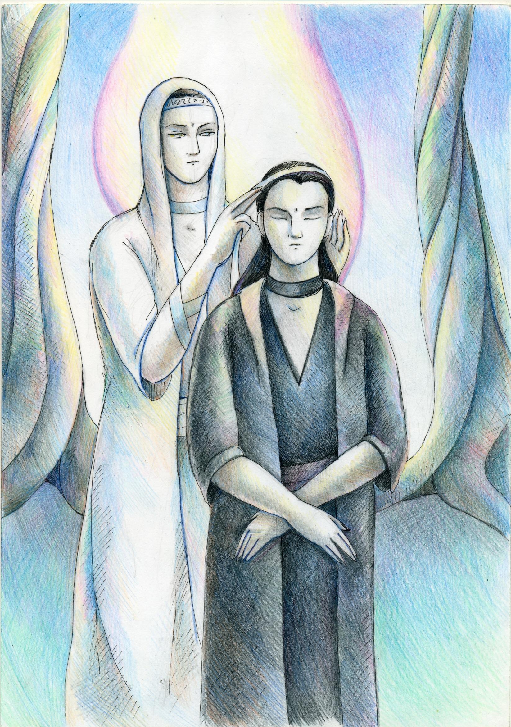 *Перед глазами Визионера следующая картина: стебли студии опустились так, что над его головой открытое небо. И в небе перед ним парят пятеро мастеров волн во главе с госпожой Джануби. Ростом каждый из них с добрую асайскую башню. Рядом с Визионером стоит один только мастер Роз в чёрном плаще. Но вдруг Визионер ощущает колебания волн и с другой стороны от него возникает еще один мастер волн в белом*