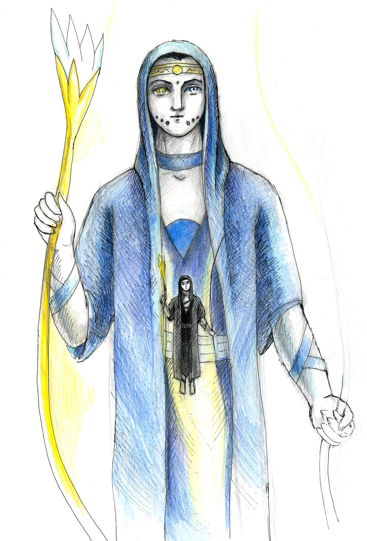 Госпожа Джануби *спускается чуть ниже, повисая в воздухе прямо над Визионером* О, с удовольствием. Синее сверхсущество Гаэ - часть Триады. К нему принято обращаться на "она", и все, кто находится под её покровительством называют её "госпожа Гаэ". Госпожа Гаэ молчалива, её последователи слышат её голос как тишайший шёпот внутри собственного сознания. И очень редко Гаэ обращается к тем, кто находится вне её. Она часто открывает будущее и потому её зовут Провидением.