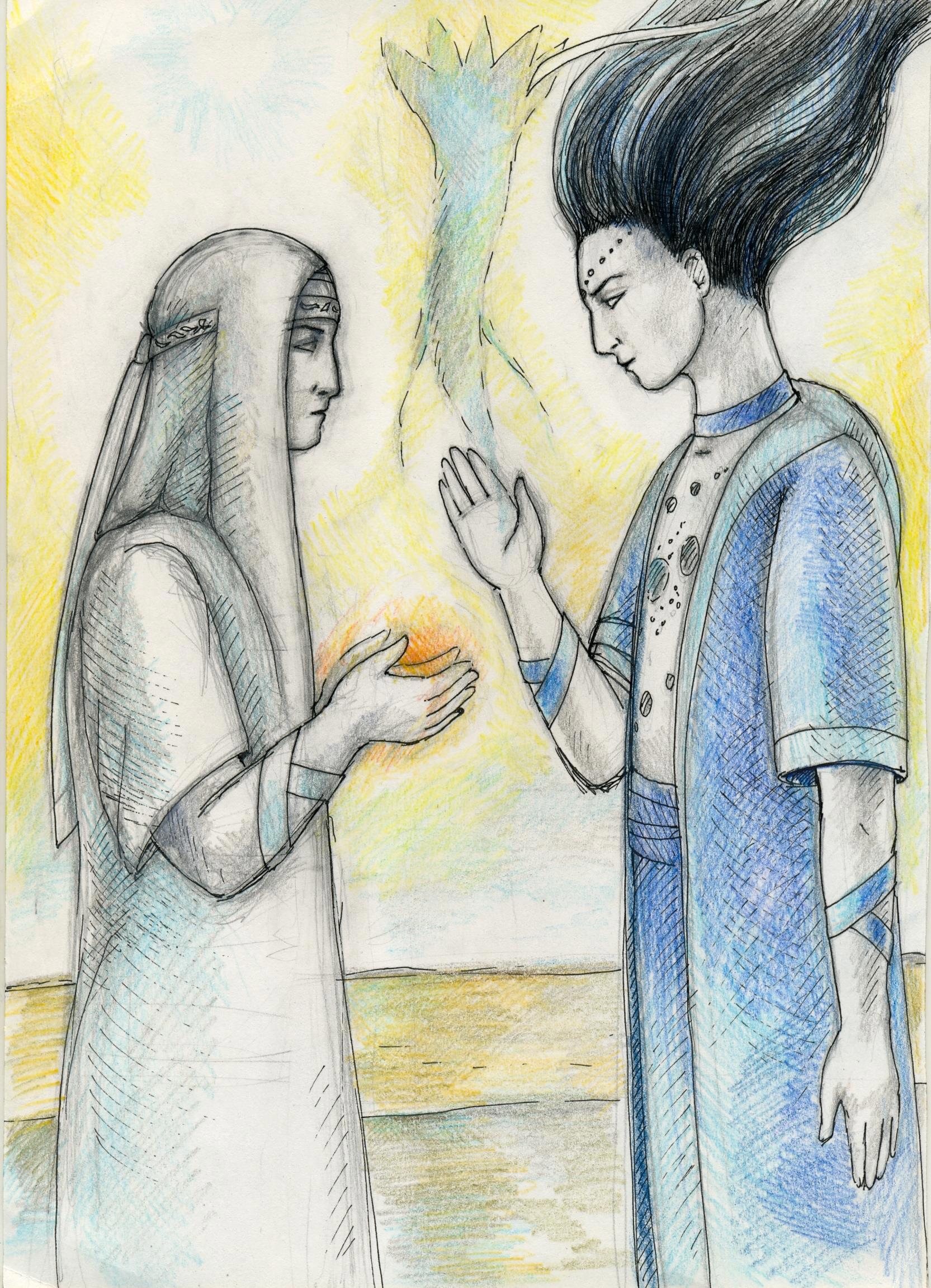 Мать Янава: Ну, начну с того, что мне очень много циклов) Я пробудилась ещё в начале Анисана и ещё помню одеяния дэви. И я очень много творила. Можете считать, что каждый шестой асай - мой потомок той или иной степени дальности. Однако у каждой творицы есть свой предел. Наступает время, когда понимаешь, что пора оставить творение. Многие творицы после этого называют себя старицами и остаются при храмах. Отдыхают, пьют амброзию и дают наставления молодым. Но я не захотела пойти таким путём и избрала себе новое дело. Теперь я мастер тонких волн и учу госпожу Джануби *Янава склоняется и Визионер слышит её шёпот прямо в голове* Госпожа Джануби, конечно, резка. Но поверьте, она была бы ещё стихийнее, если бы я не смягчала её нрав *Янава восклоняется и её голос снова слышно всем* Ну и в завершение. Если кто хотел посмотреть на маму абы Альтаса, то вот она я!