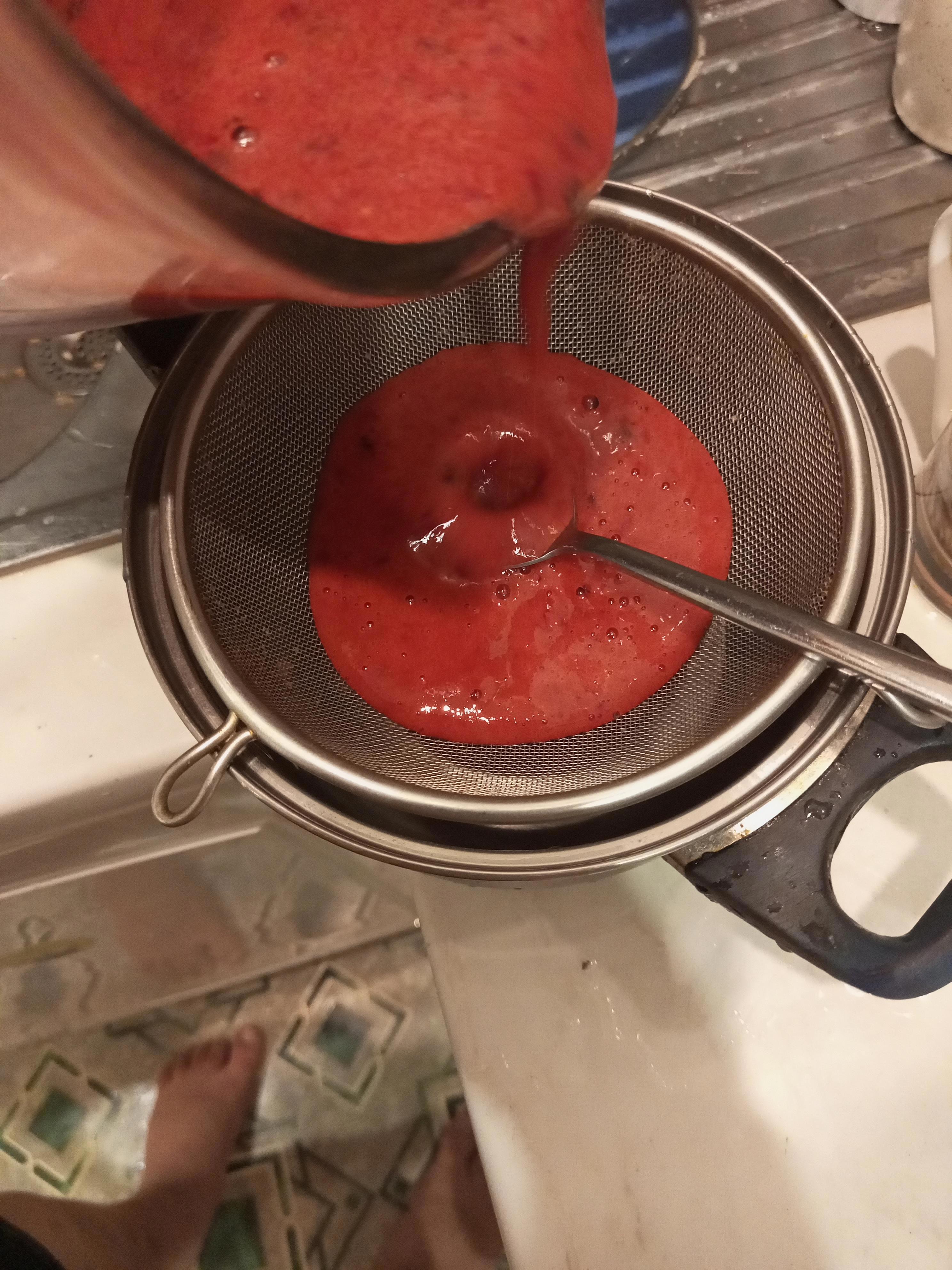 Полученную смесь выливаем через сито в небольшую кастрюльку. Тщательно перемешивайте ложкой смесь, чтобы хорошенько процедить и отделать жидкость от жмыха. Да, это геморно, но я вас предупреждал. (Хоба! нога!)