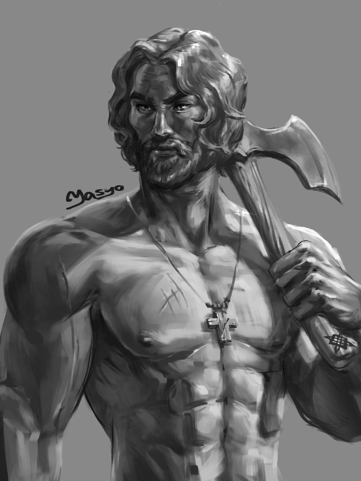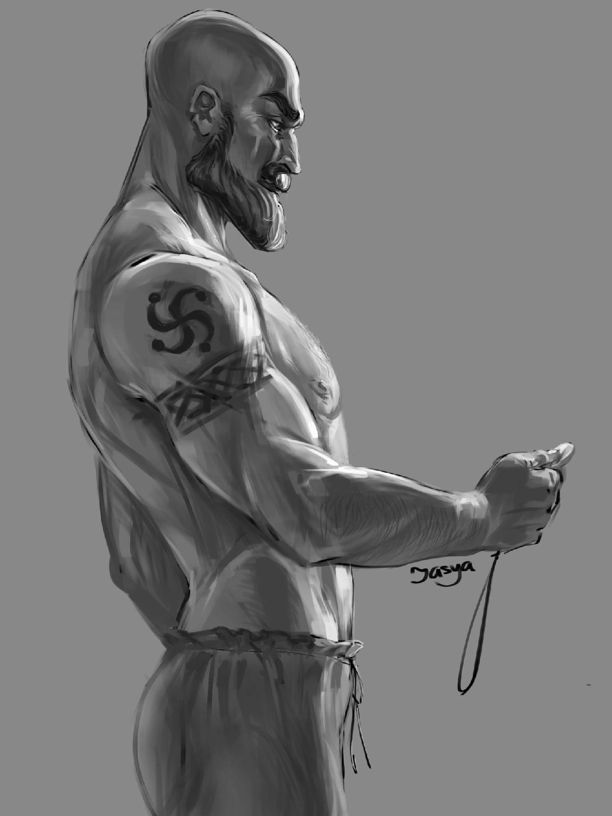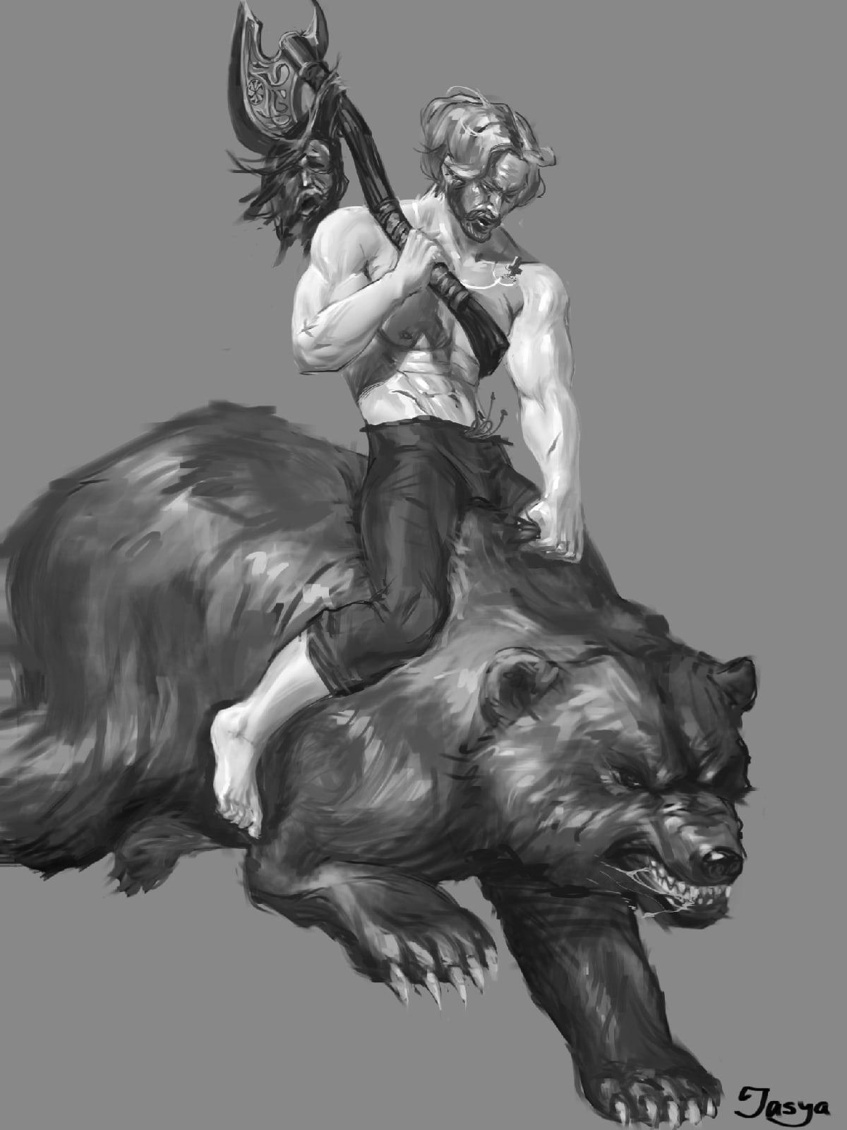 У него есть крутой боевой медведь, верный товарищ по имени Бук. На первом скетче я его нарисовала маленьким, сча по идеи он ок. 4 метров в высоту и у него только один рабочий глаз