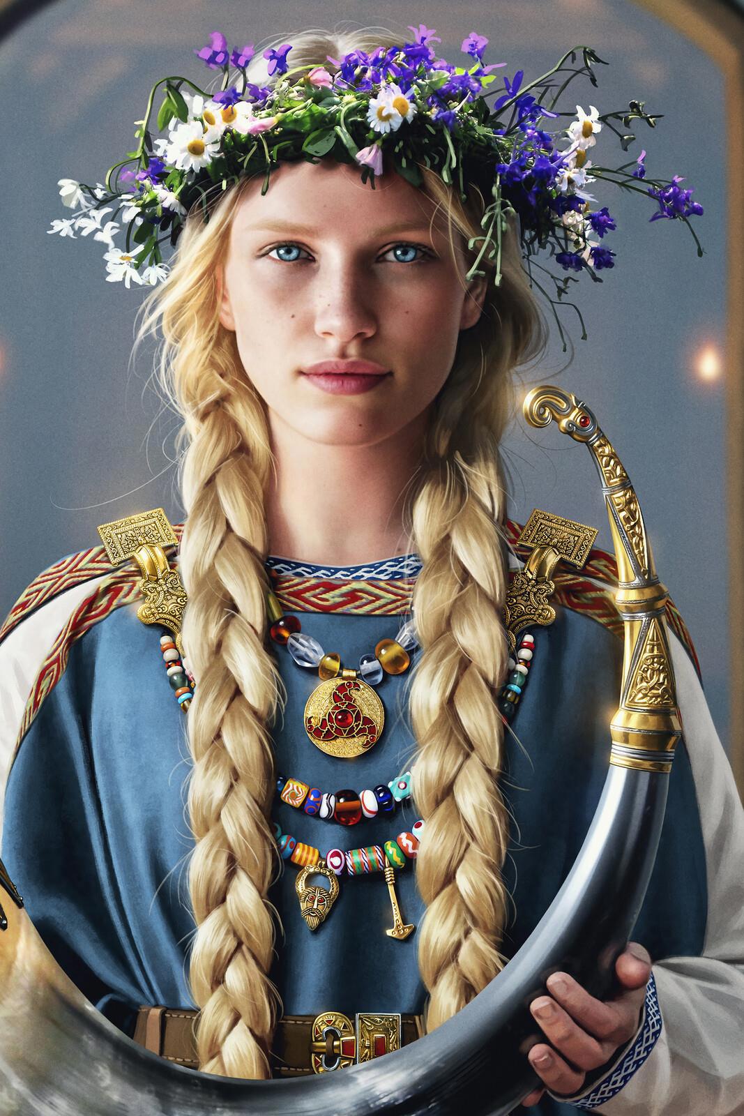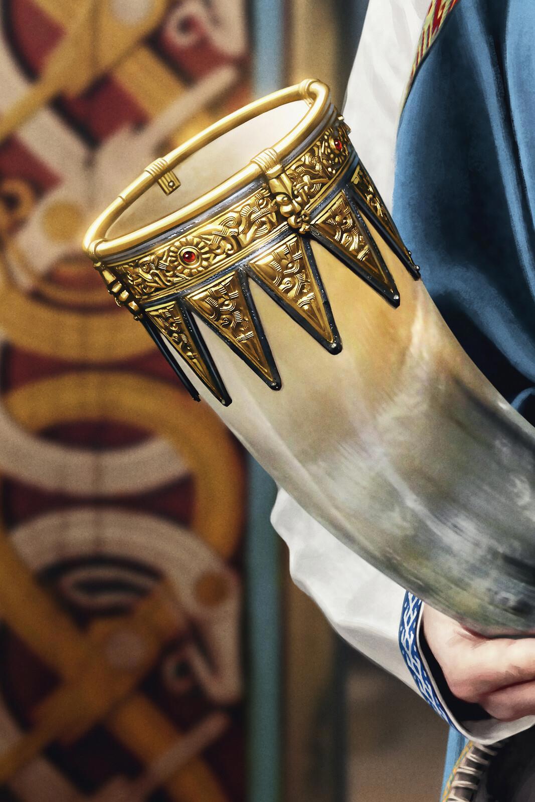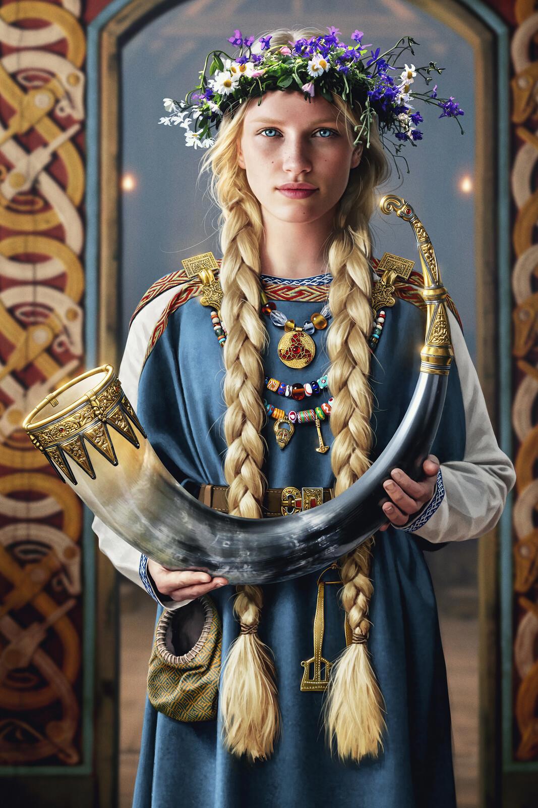 ANGLO-SAXON QUEEN, from the pagan period (6th century), bearing a ceremonial drinking horn, based on a passage from the epic poem “Beowulf” in which queen Wealhtheow serves mead to the Danish king Hrothgar, the Geatish hero Beowulf and his warriors before they fight the monster Grendel.