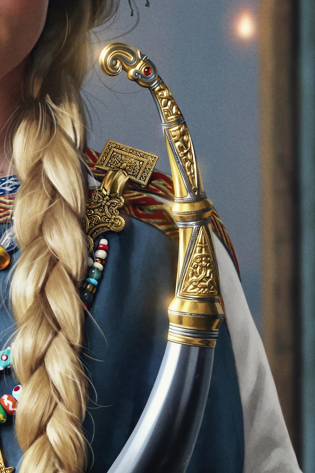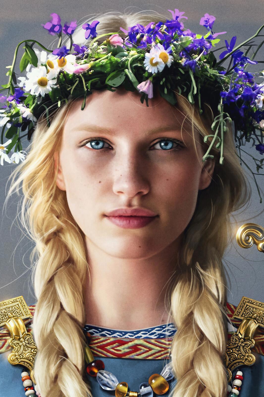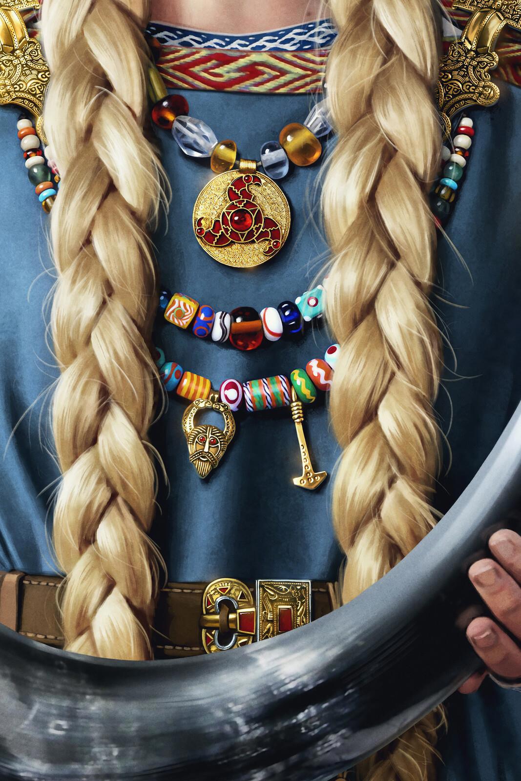 ANGLO-SAXON QUEEN, from the pagan period (6th century), bearing a ceremonial drinking horn, based on a passage from the epic poem “Beowulf” in which queen Wealhtheow serves mead to the Danish king Hrothgar, the Geatish hero Beowulf and his warriors before they fight the monster Grendel.