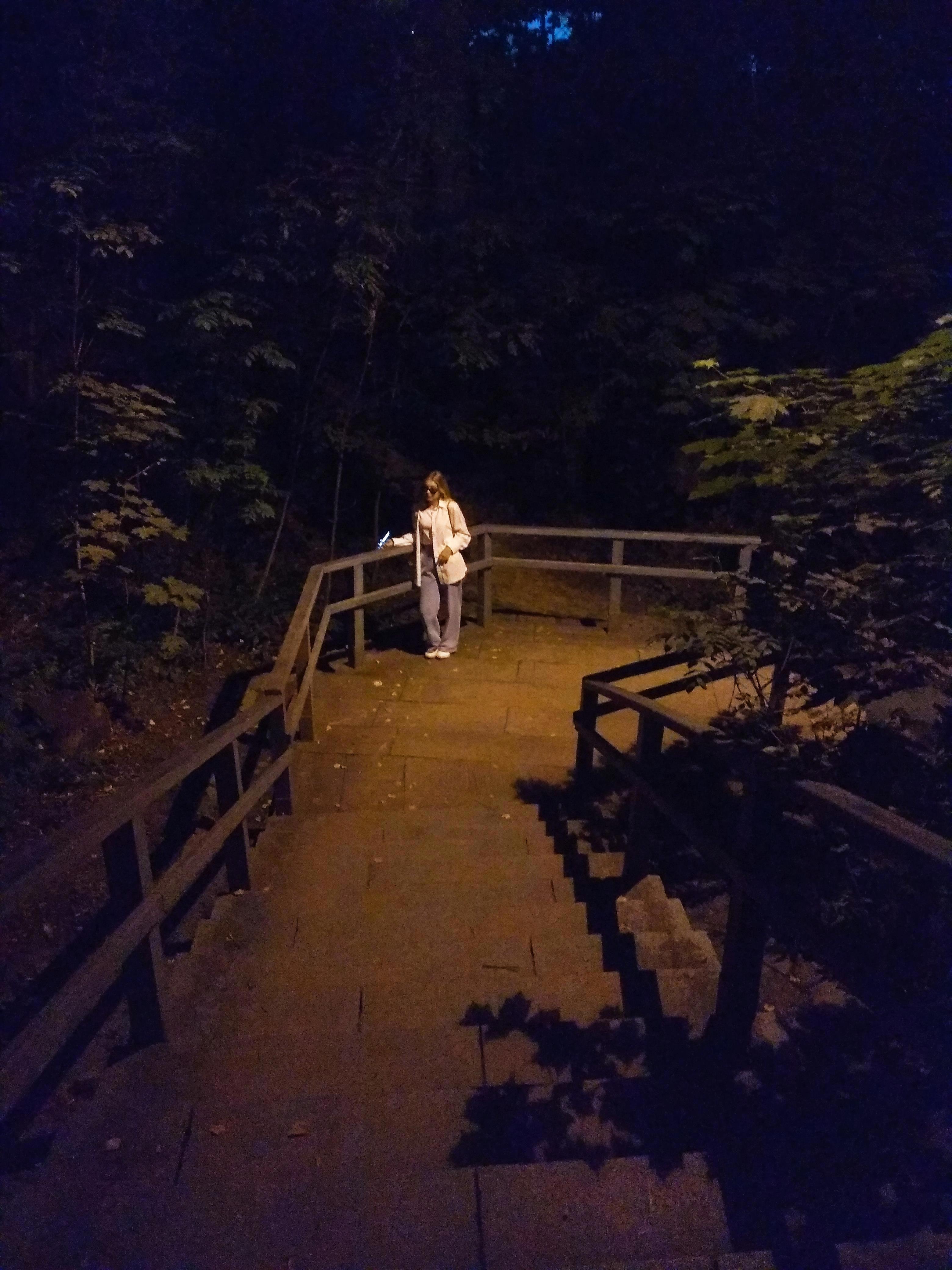 День у нас был загружен вплоть до семнадцати. Пока приготовили поесть, пообедали, приняли душ, собрались, было уже девятнадцать с хвостиком. Опять же, в интернете указано, что канатка работает до двадцати одного часа. Представляете, как мы летели через весь город с пересадками на Воробьёвы горы?! И потом еще неслись по тропам через заказник, стараясь успеть хотя бы к без пятнадцати девять!))