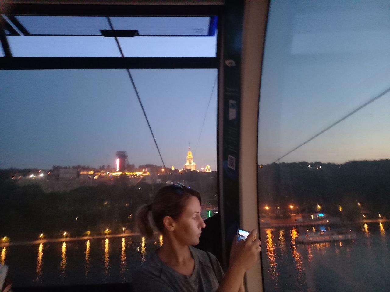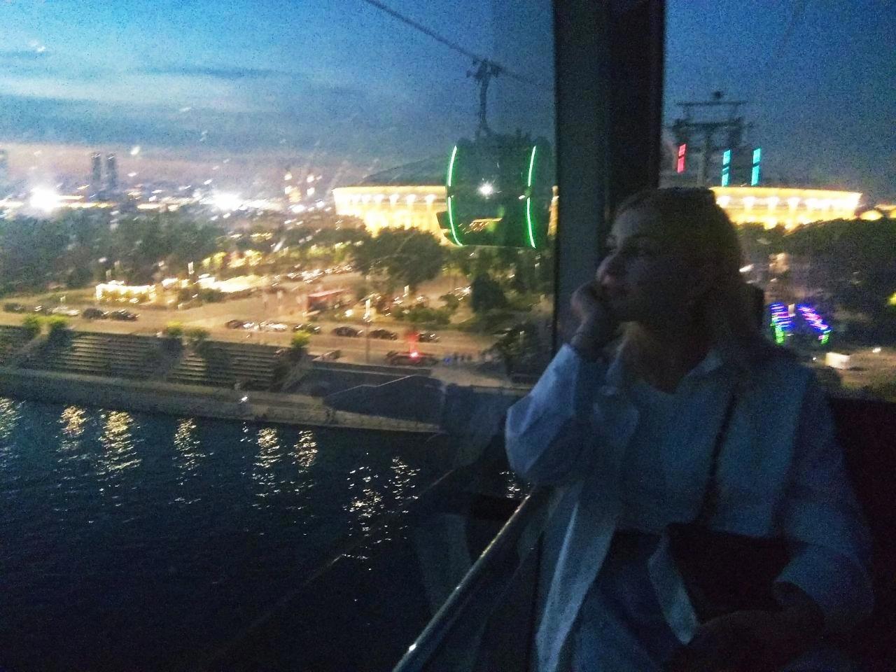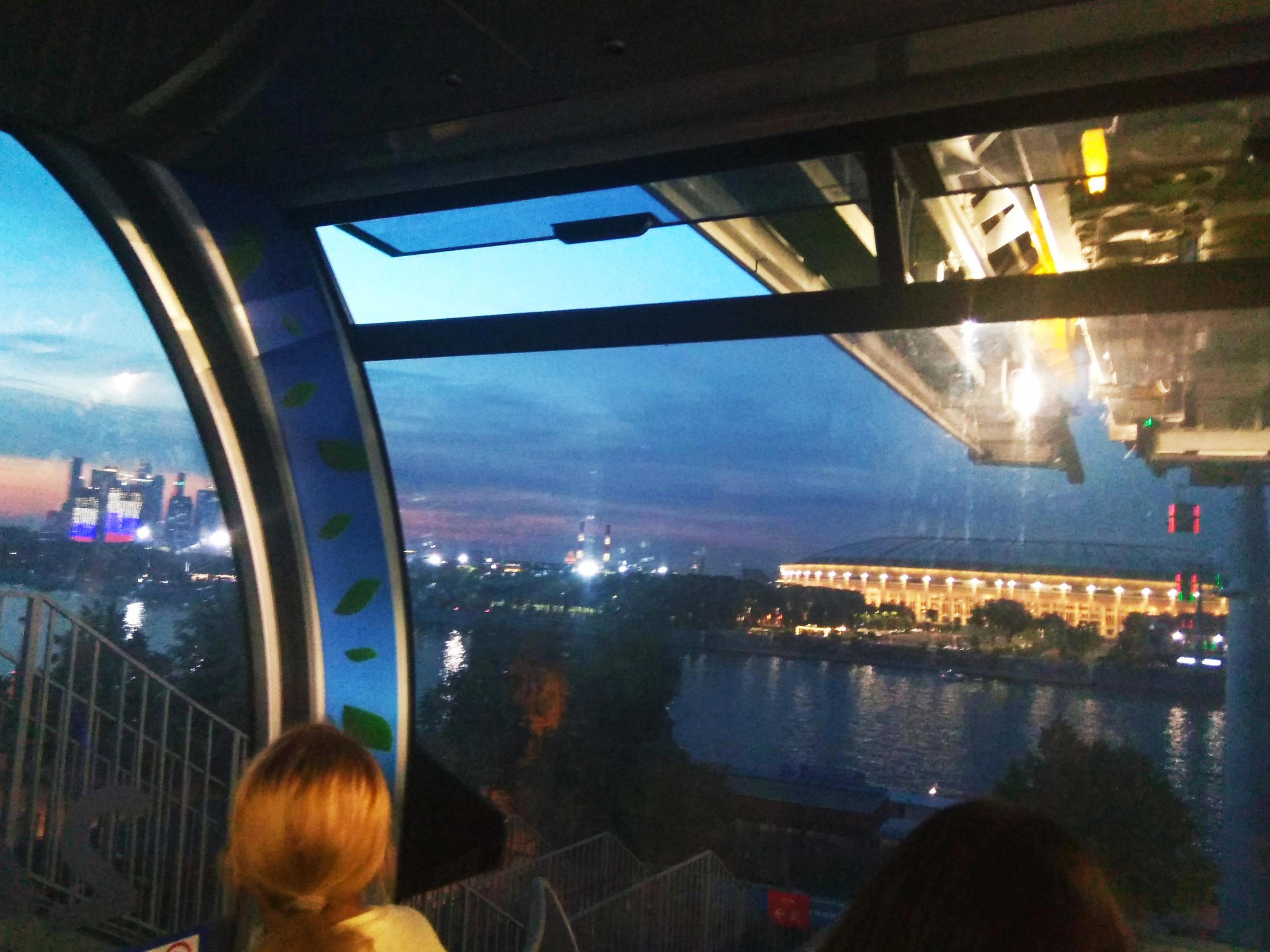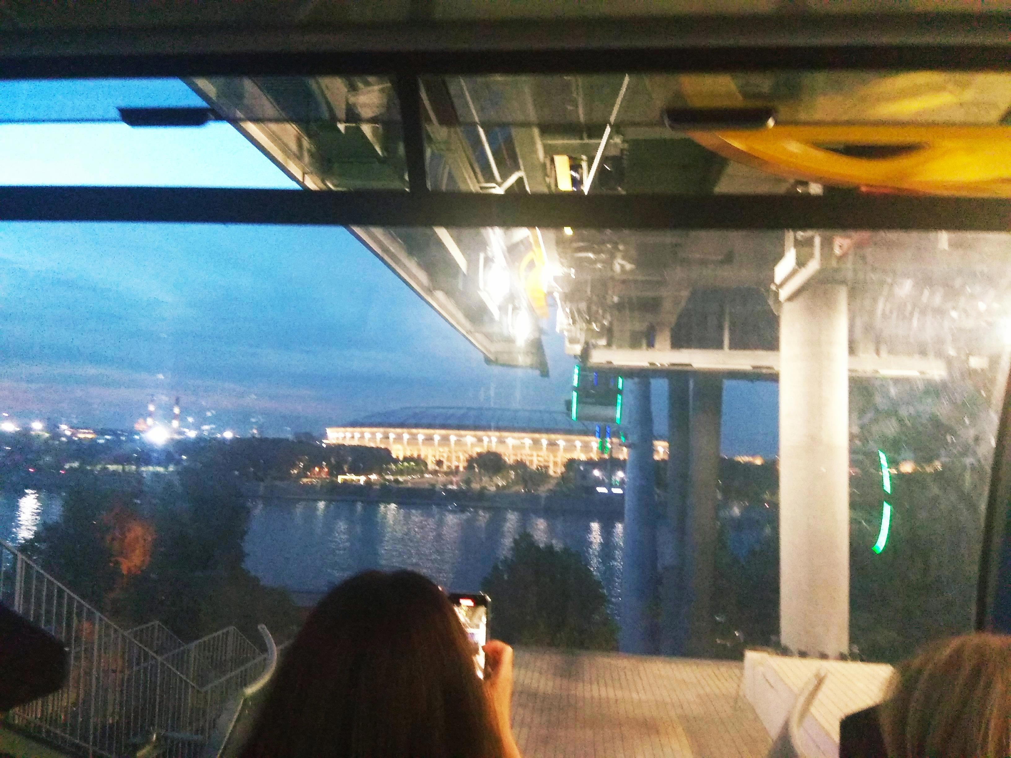 Здесь нас ожидали такие же кабинки, которые, к тому же, парят над землей целых пятнадцать минут в одну сторону, тем паче, мы взяли билеты в два конца (всего по сто пятьдесят р.)! Так вот, эти кабинки парят над землей, над Москвой-рекой, над стадионом Лужники и спортсменами, гоняющими мяч. Но мне показалось, что я просто еду в метро, выехав из тоннеля на свет божий, не более того...