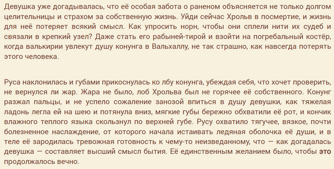 Ладно, идем дальше. После оказания первой помощи Руса остается с конунгом и его ближайшими помощниками, узнает о печальной судьбе семьи, жившей в этом доме. Но это все колышет ее и близко не так сильно, как ослепительная красота бессознательного конунга. Поэтому где-то спустя полдня любования его спящей тушкой Руса приходит вот к этому: