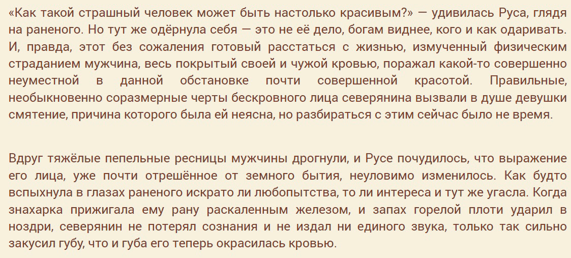 В-третьих, перед ней мужик весь в кровяке собирается двинуть кони. Немного не тот момент, чтоб восхищаться его лицом, нет? А главное что конунг, близкий к потере сознания, во время всяких очень болезненных процедур, включая прижигание раны, тоже умудряется на Русу заинтересованно пялиться!