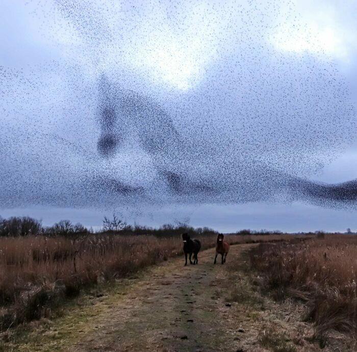 Огромные скопления птиц, сбившихся в стаю, иногда начинают двигаться очень скоординированно, меняя при этом направления и зачастую формируя на небе довольно замысловатые фигуры. И это не хаотичные, а четко выверенные перестроения внутри стаи - птицы четко знают, куда лететь, синхронно разворачиваются, никогда не сталкиваясь друг с другом. Чем вызваны эти птичьи перестроения внутри стаи, пока не ясно.