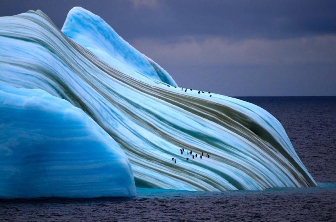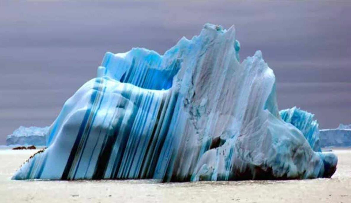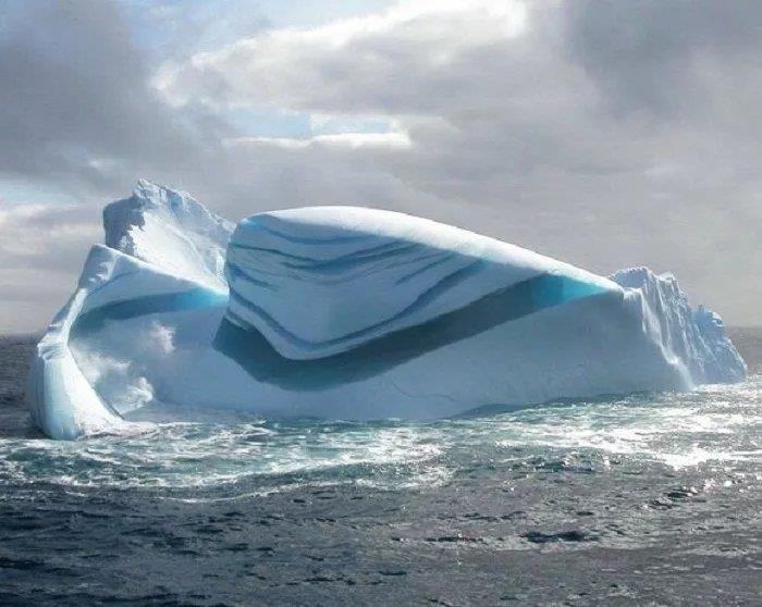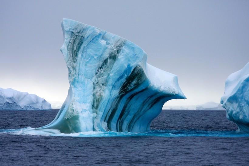 Антарктида известна своими нетронутыми белыми айсбергами, ледниками и пещерами.  Но есть среди них и необычные, цветные айсберги - они покрыты множеством черных, коричневых, желтых, или синих полос!