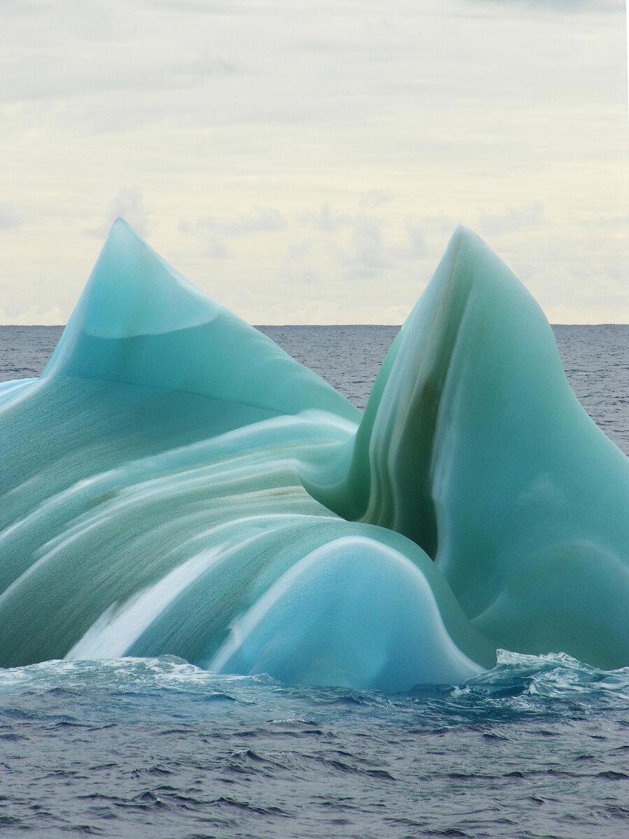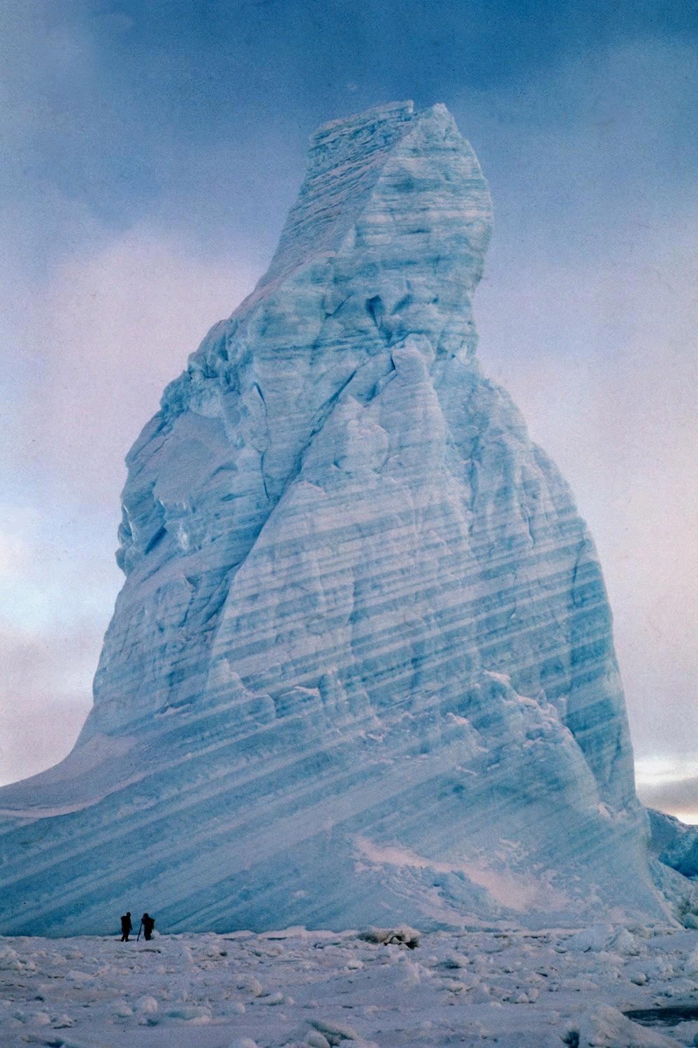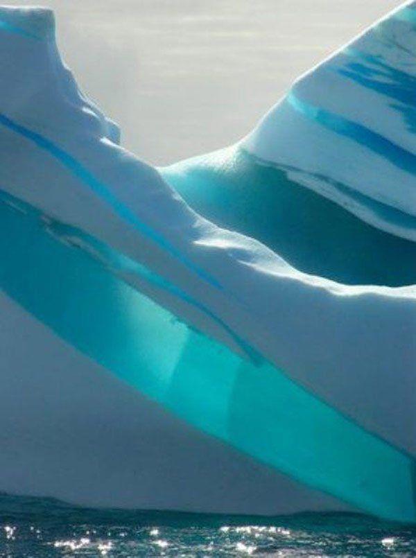 Но есть среди них и необычные, цветные айсберги - они покрыты множеством черных, коричневых, желтых, или синих полос!  Такие разноцветные айсберги формируются в открытом море из отколовшихся кусков льда.