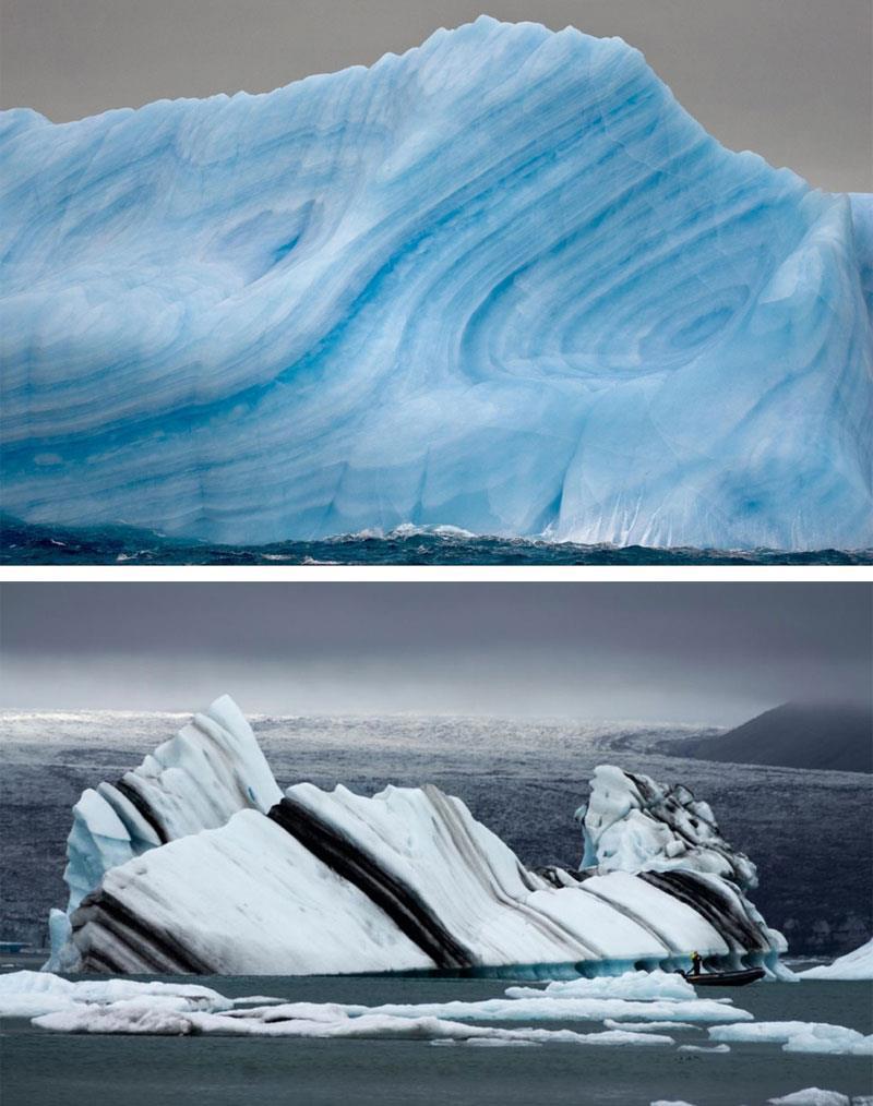 Причиной темных полос на айсбергах часто является содержащийся в них вулканический пепел.  Такие айсберги возникают при сползании в воду ледяных шапок вулканов при их нагревании.