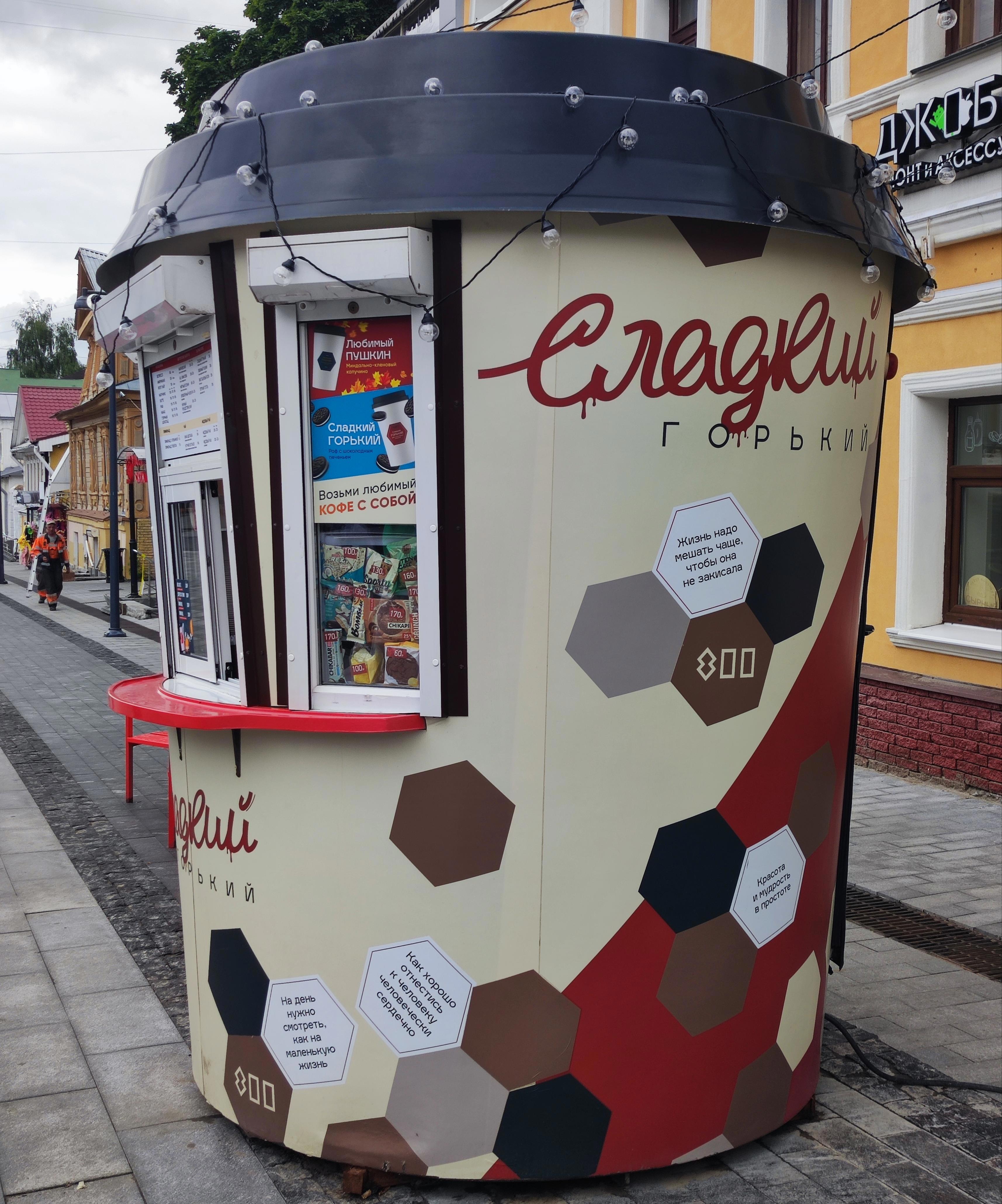 А ещё тут есть ресторан «Пяткинъ» и кофейня «Сладкий Горький», где моя жена взяла чай Жгучий Булгаков, а я кофе Терпкий Гоголь. И что мне нравится в отличие от столицы, где этого днём с огнём не найдёшь, тут есть рестораны русской кухни, хотя и паназиатскую, среднеазиатскую, итальянскую и грузинскую вы тут тоже найдёте. Да и простого фастфуда тоже полно.