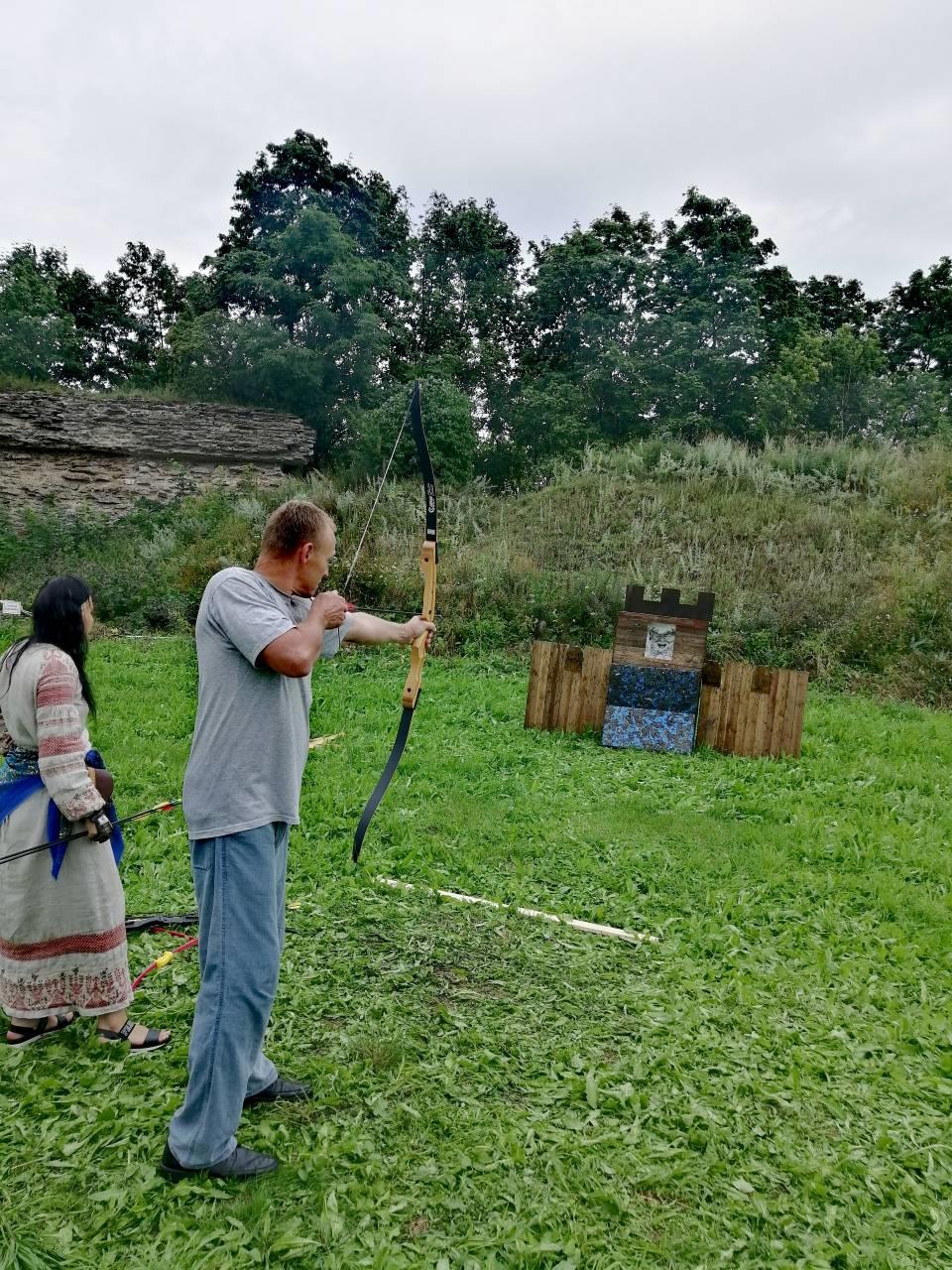 Меня с топорами вы уже видели, а вот муж больше любит из лука стрелять: