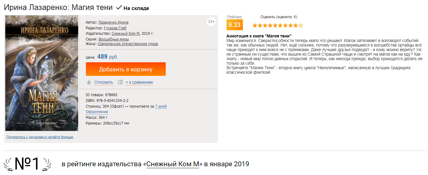 Итак, "Магия тени", очень любимый и долгожданный мой роман, появился в книжных магазинах. Вскоре после появления в Лабиринте стал самой продаваемой книгой издательства в январе - это закономерно для новинки, но всё равно греет мне душу и намекает, что не зря я всем вот этим занимаюсь :)