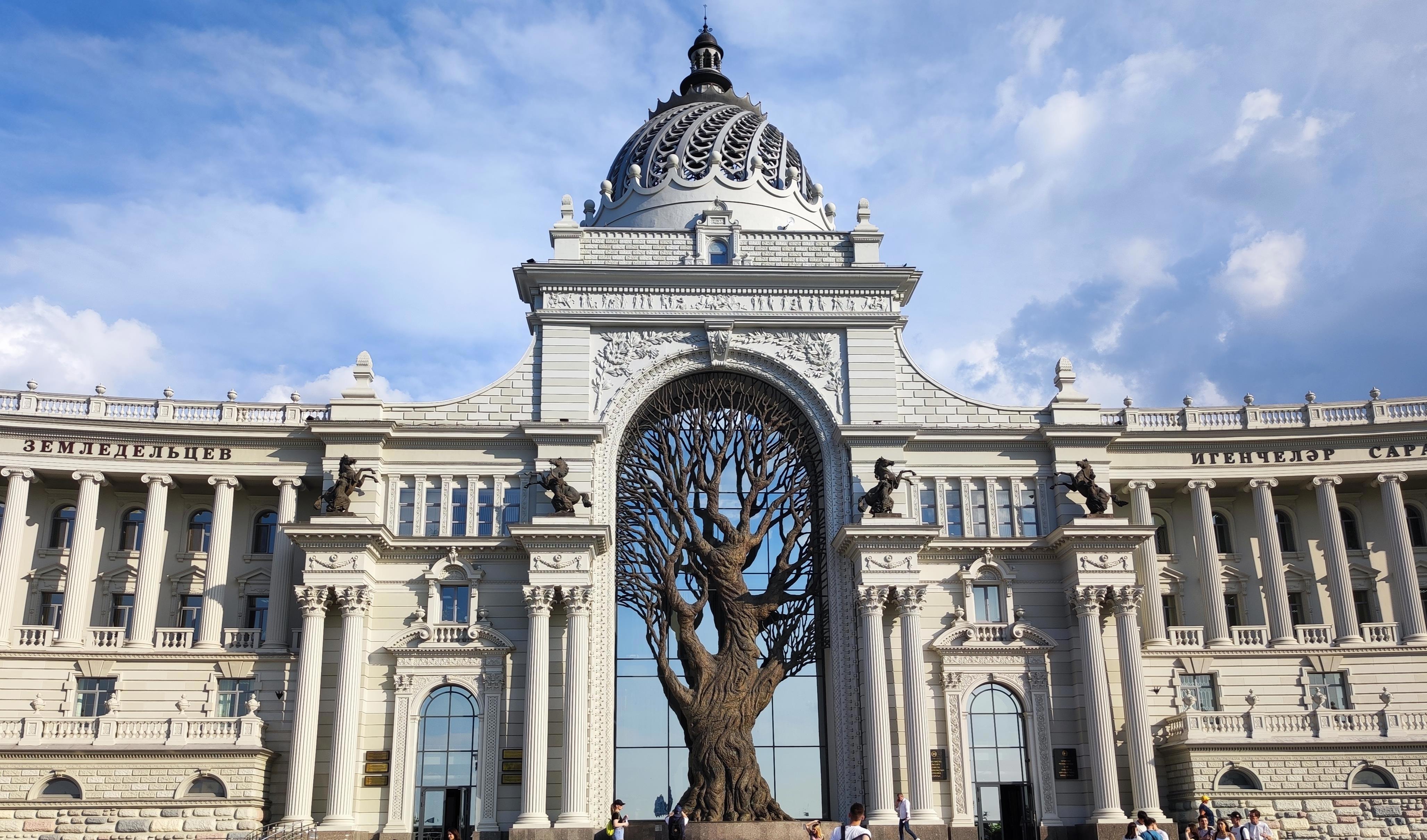 Рядом с кремлем расположилась шикарная набережная, вдоль речки Казанки, и тут же современное здание Земледельцев, которое стало визитной карточкой всех инстатёлок Поволжья. Да, именно там произрастает то каменное дерево, которое мы обозреваем на фоне загорелых ножек симпатичных сисясточек.