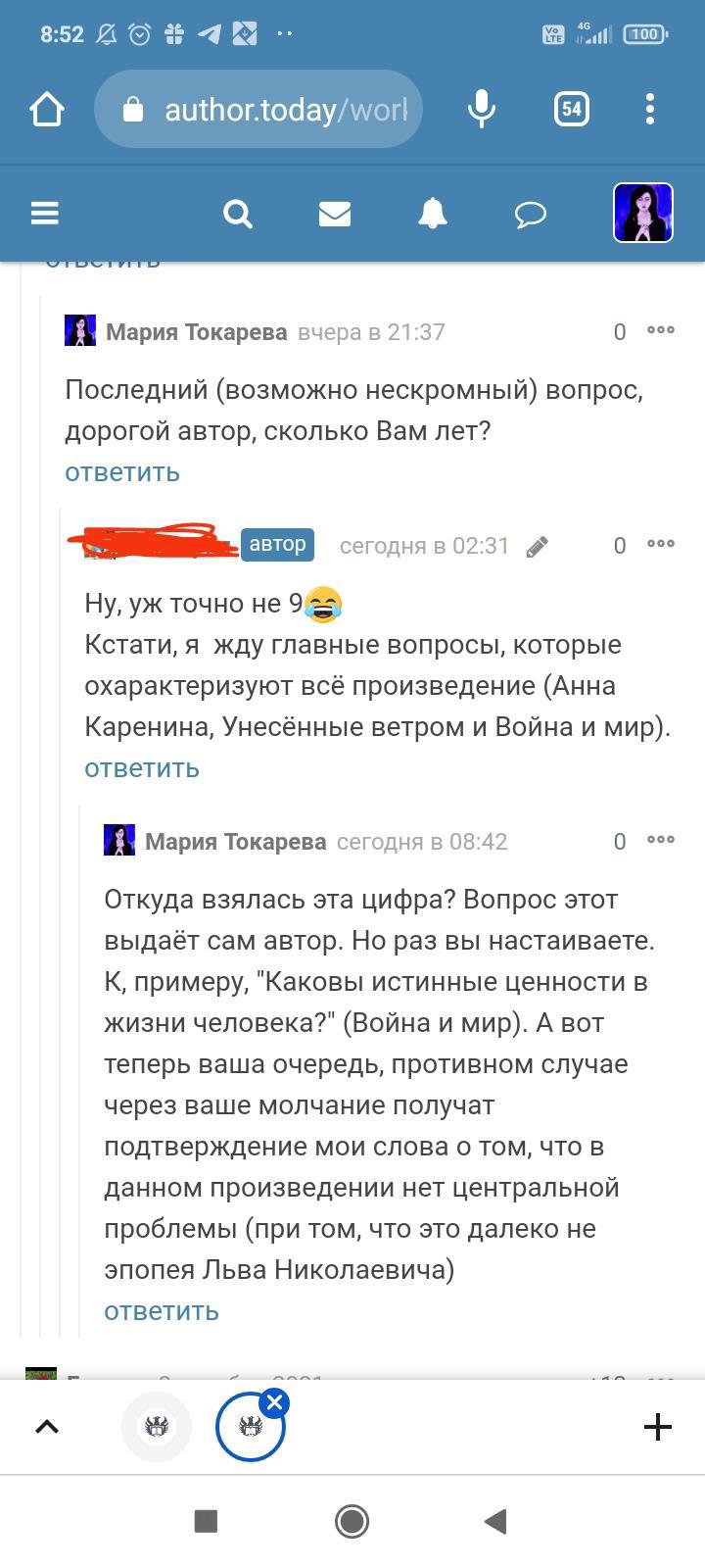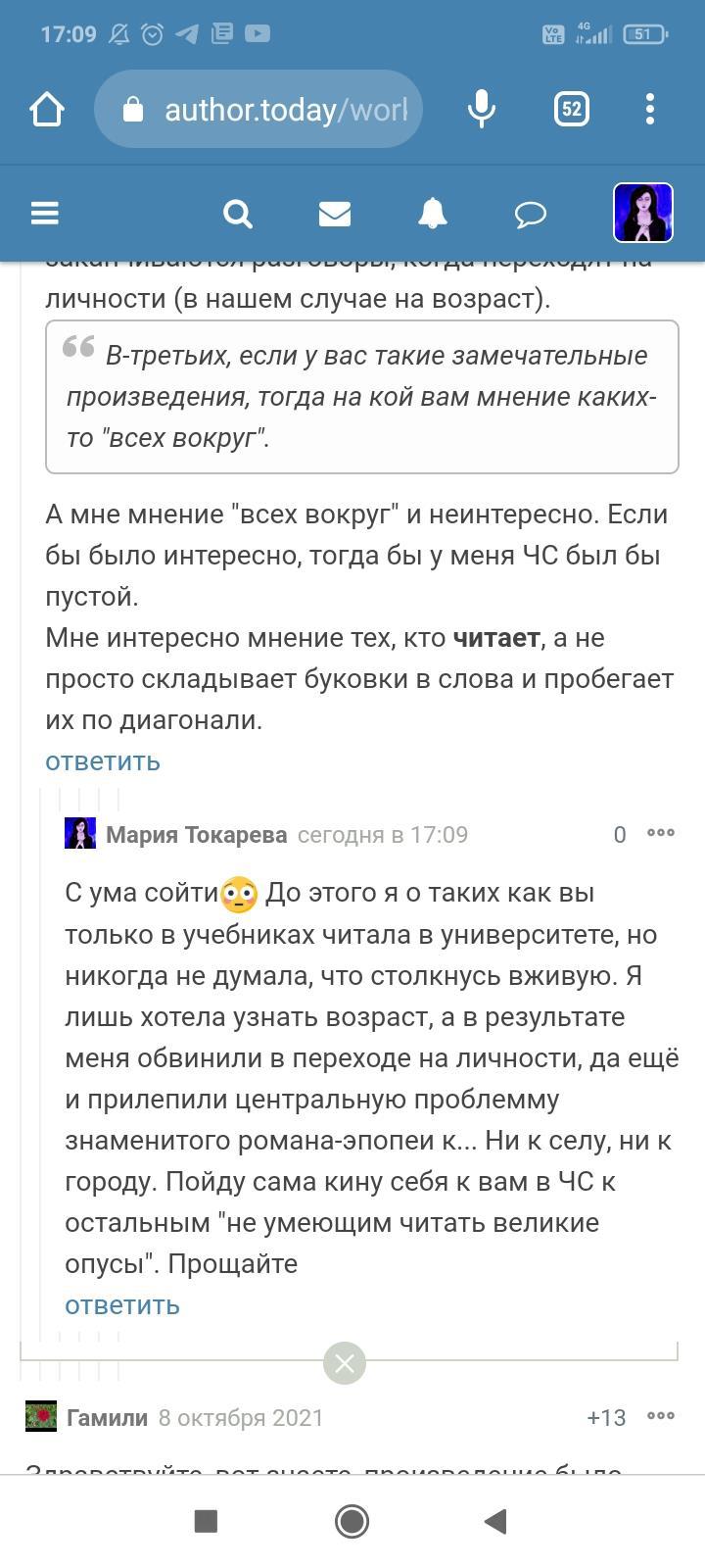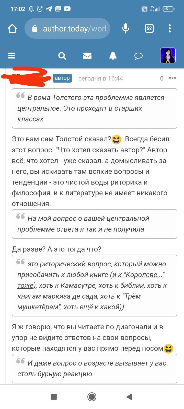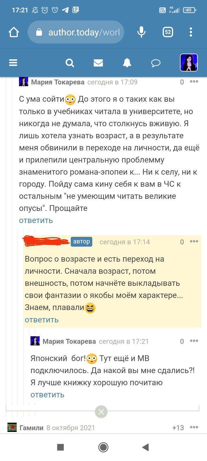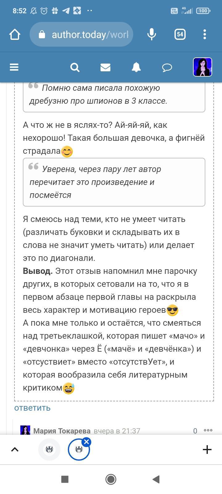 Автор писала что-то ещё, но я не стала обращать на это внимание. Для меня разговор закончился, но не для данного автора. Видимо заметив, что я игнорирую комментарий и на дальнейшие провокации не ведусь, в бессильной злобе "непонятый гений" не поленился, зашëл на страницы моих немногочисленных произведений и поставил дизлайки под всеми комментариями. Даже простое "Спасибо" вызвало у этого человека жгучую ненависть и заслужило дизлайк. Я на АТ недавно, в отличии от этого автора, поэтому мой лайк равен лишь одной единице. А вот этот индивид обладает тремя. В результате замечательные комментарии моих читателей незаслуженно ушли в минус. Я бы не стала писать всë это, ведь таких людей жалеть нужно, а не высмеивать. Честное слово, я просто хотела забыть это как страшный сон. Но "великий писатель" подпалил мне кровь и не оставил другого выбора.