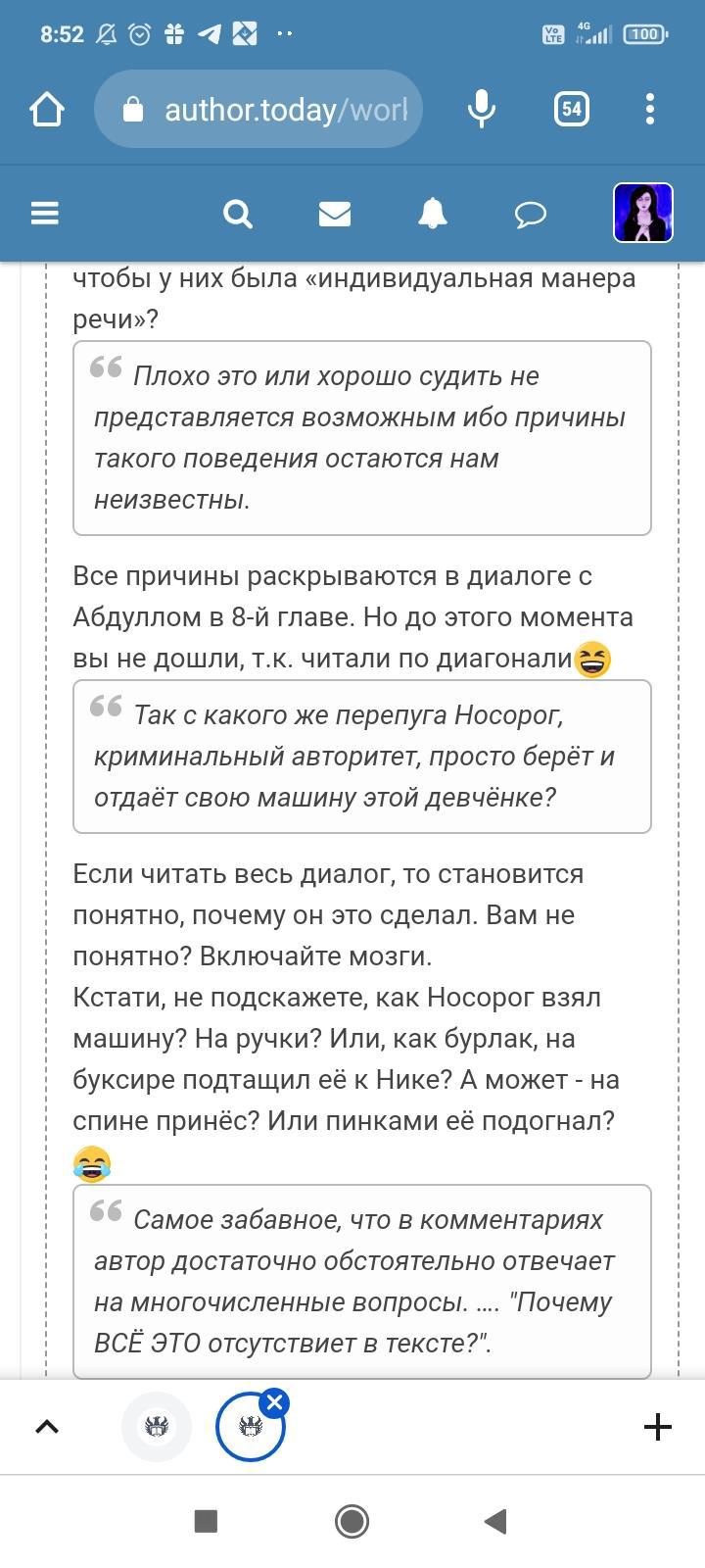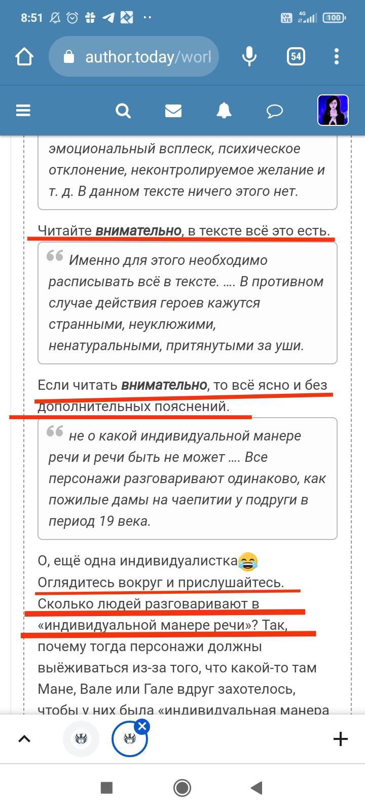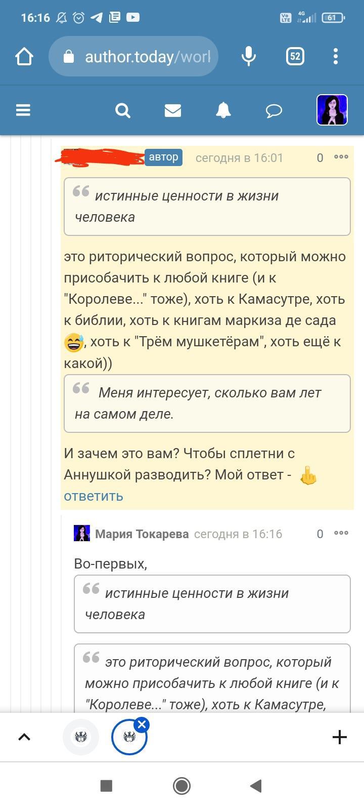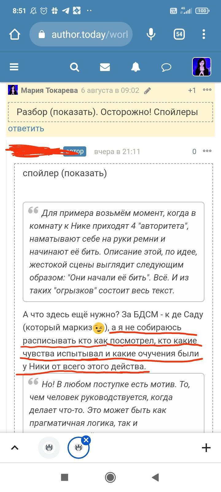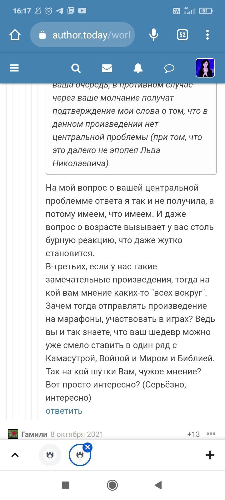Автор писала что-то ещё, но я не стала обращать на это внимание. Для меня разговор закончился, но не для данного автора. Видимо заметив, что я игнорирую комментарий и на дальнейшие провокации не ведусь, в бессильной злобе "непонятый гений" не поленился, зашëл на страницы моих немногочисленных произведений и поставил дизлайки под всеми комментариями. Даже простое "Спасибо" вызвало у этого человека жгучую ненависть и заслужило дизлайк. Я на АТ недавно, в отличии от этого автора, поэтому мой лайк равен лишь одной единице. А вот этот индивид обладает тремя. В результате замечательные комментарии моих читателей незаслуженно ушли в минус. Я бы не стала писать всë это, ведь таких людей жалеть нужно, а не высмеивать. Честное слово, я просто хотела забыть это как страшный сон. Но "великий писатель" подпалил мне кровь и не оставил другого выбора.