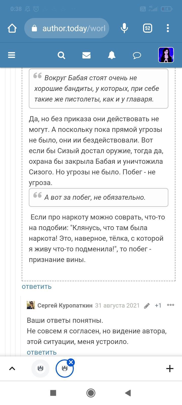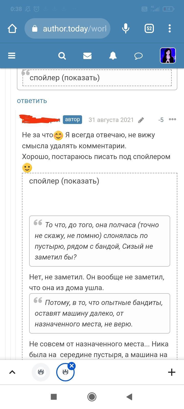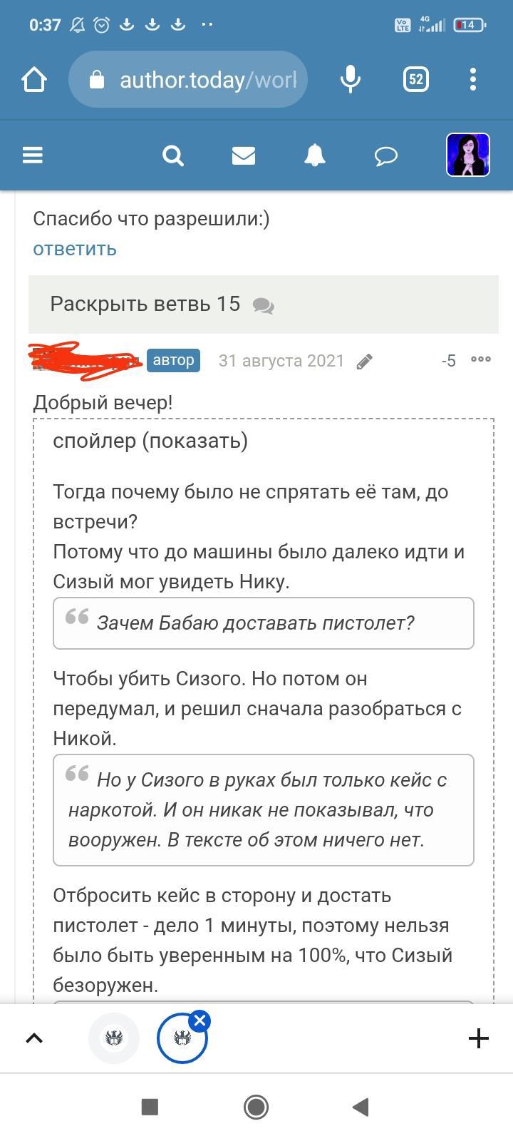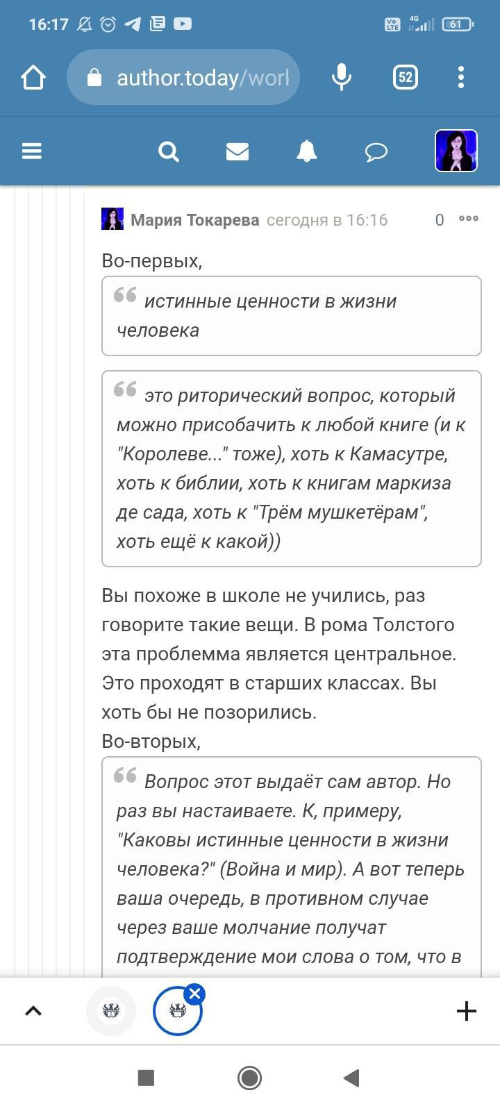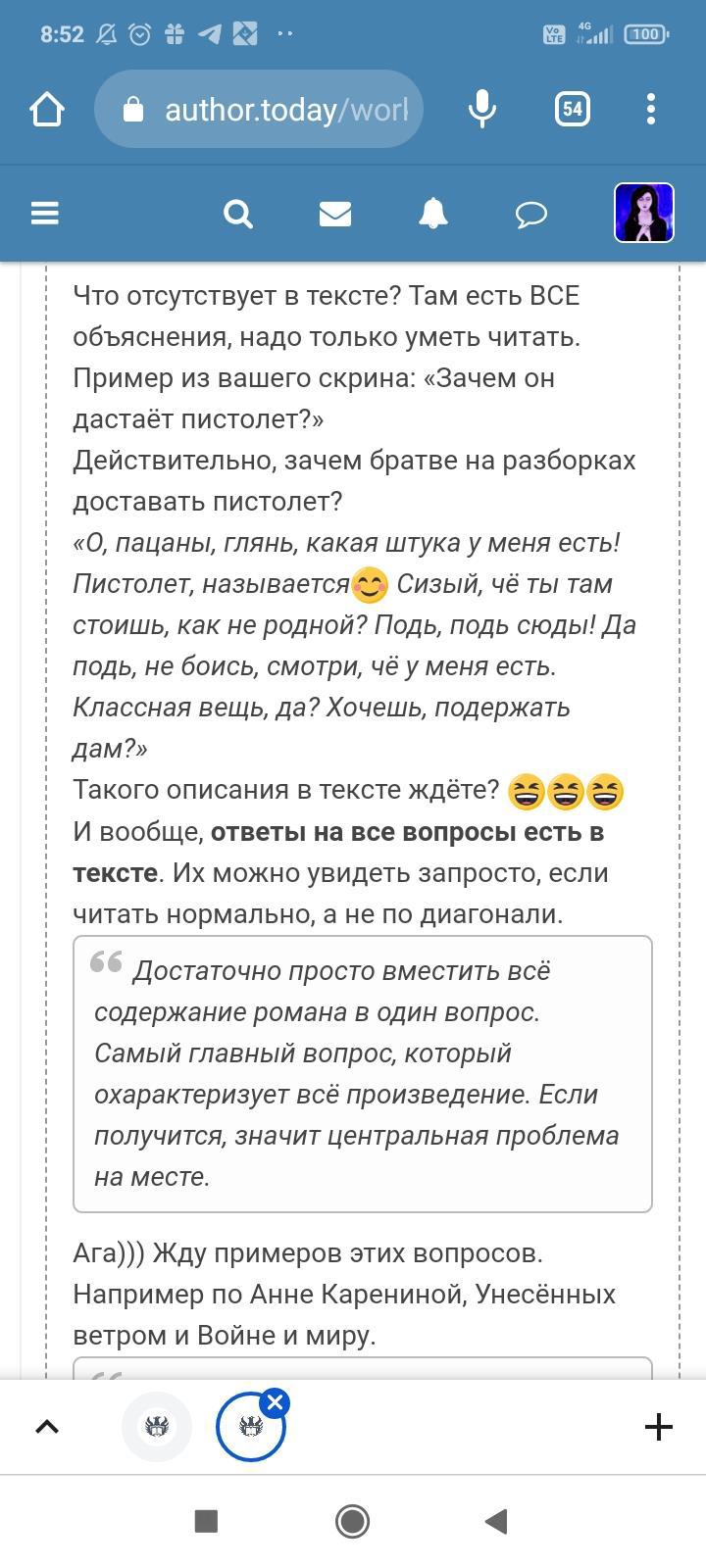 Автор писала что-то ещё, но я не стала обращать на это внимание. Для меня разговор закончился, но не для данного автора. Видимо заметив, что я игнорирую комментарий и на дальнейшие провокации не ведусь, в бессильной злобе "непонятый гений" не поленился, зашëл на страницы моих немногочисленных произведений и поставил дизлайки под всеми комментариями. Даже простое "Спасибо" вызвало у этого человека жгучую ненависть и заслужило дизлайк. Я на АТ недавно, в отличии от этого автора, поэтому мой лайк равен лишь одной единице. А вот этот индивид обладает тремя. В результате замечательные комментарии моих читателей незаслуженно ушли в минус. Я бы не стала писать всë это, ведь таких людей жалеть нужно, а не высмеивать. Честное слово, я просто хотела забыть это как страшный сон. Но "великий писатель" подпалил мне кровь и не оставил другого выбора.