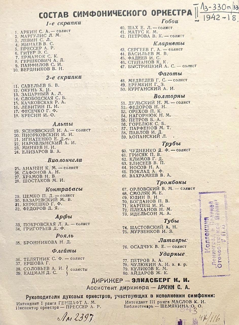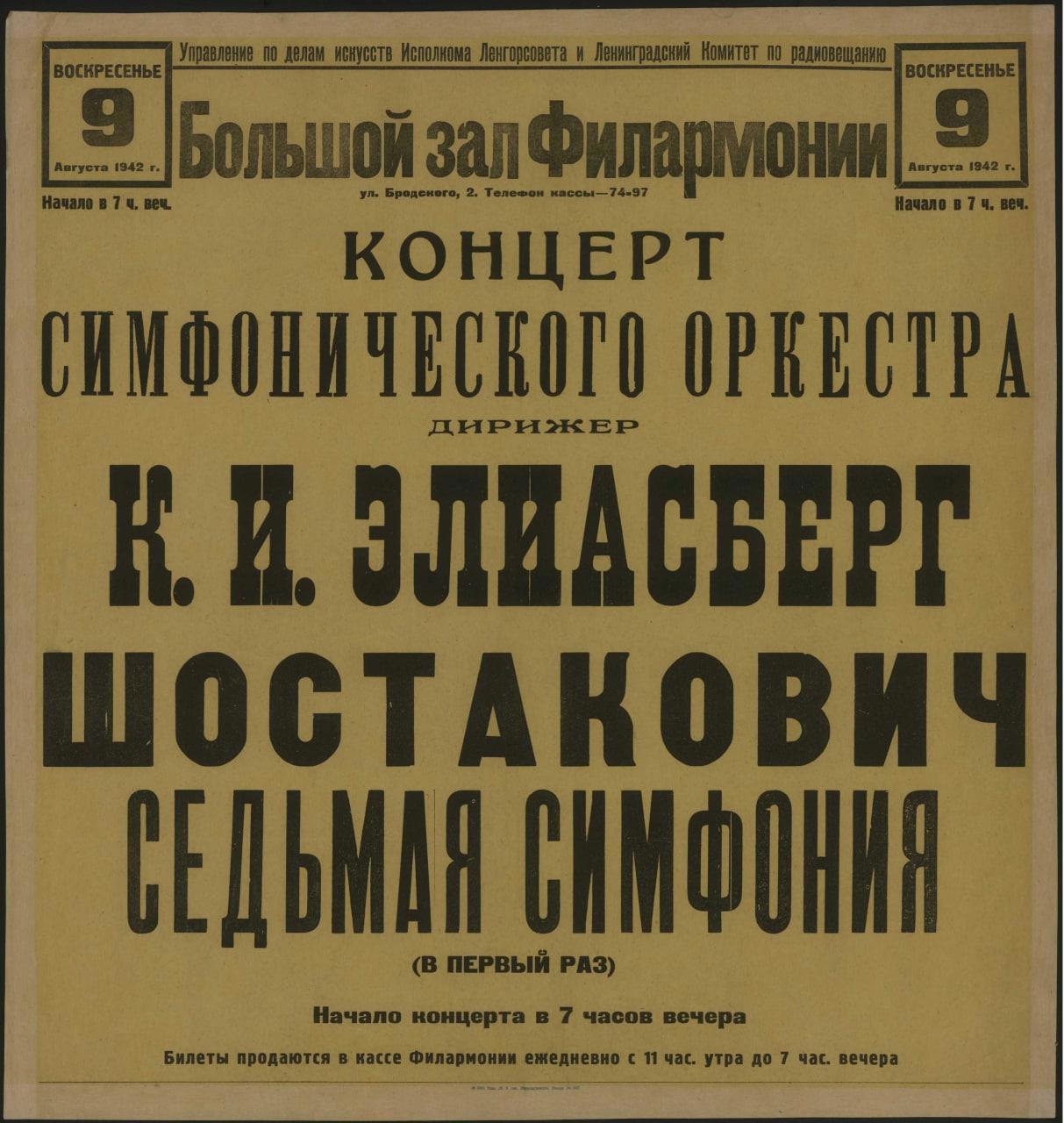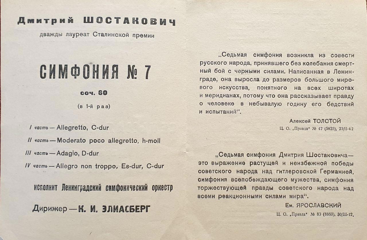 Симфония Шостаковича была исполнена в Ленинградской филармонии симфоническим оркестром под управлением дирижера К.И. Элиасберга с возможной тщательностью, большим подъемом и с подлинным вдохновением, в особенности в финалах первой и последней части» («Смена», 11 августа 1942 года).