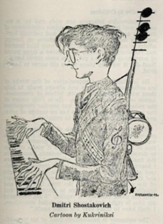 Дружеский шарж от Кукрыниксов: Дмитрий Шостакович за роялем с перекрещёнными пулемётными лентами на груди, как революционный матрос, только на лентах вместо патронов — ноты. За спиной винтовка— штык заканчивается тоже нотами. И кажется, что у него пятнадцать пальцев на руках, так блестяще он играет.