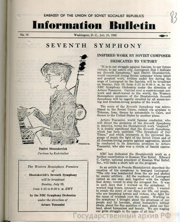 Советское посольство в США издавало информационные бюллетени — вот номер за 18 июля 1942 года, посвящённый Седьмой симфонии. «Партитура Седьмой симфонии была заснята на микрофильм, стремительно доставлена самолётом в Тегеран, оттуда на машине в Каир и снова самолётом в Нью-Йорк». Там фотографы распечатали партитуру с плёнки, чтобы американские оркестры выучили музыку к премьере.