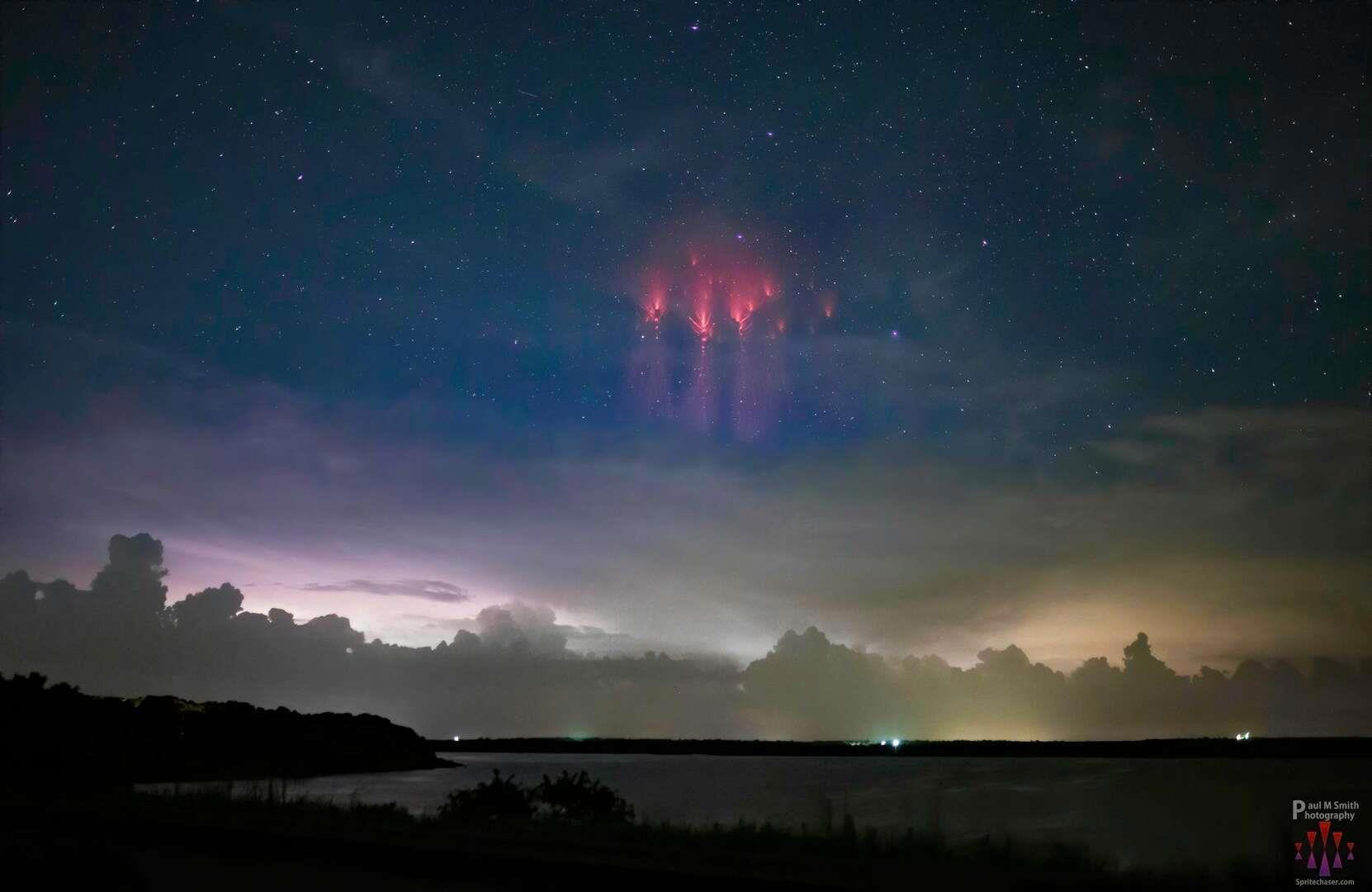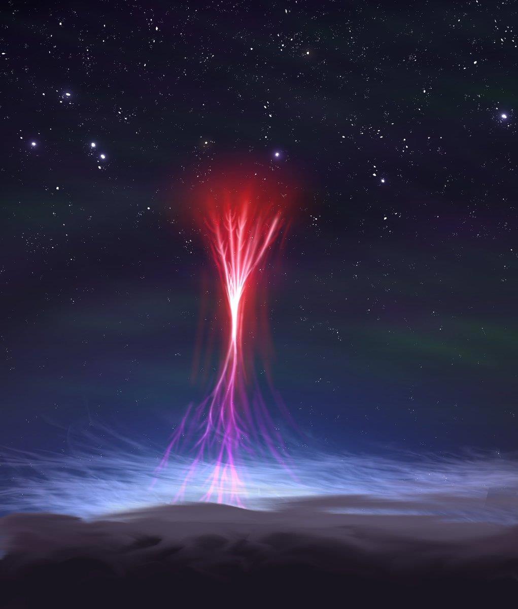 Спрайты – это мощные, яркие вспышки обычно красного цвета, возникающие высоко в атмосфере, выше грозовых туч, на высоте от 80 км. В диаметре они могут быть от 50 км и более.