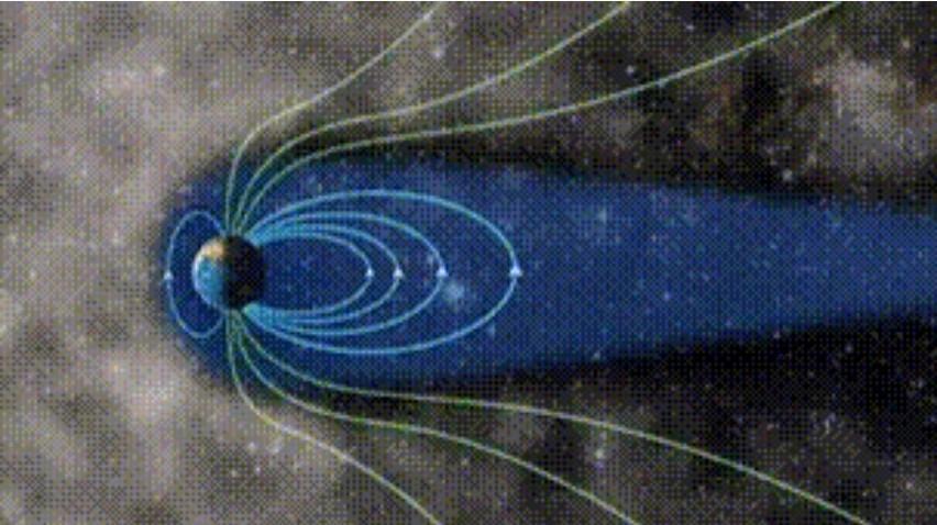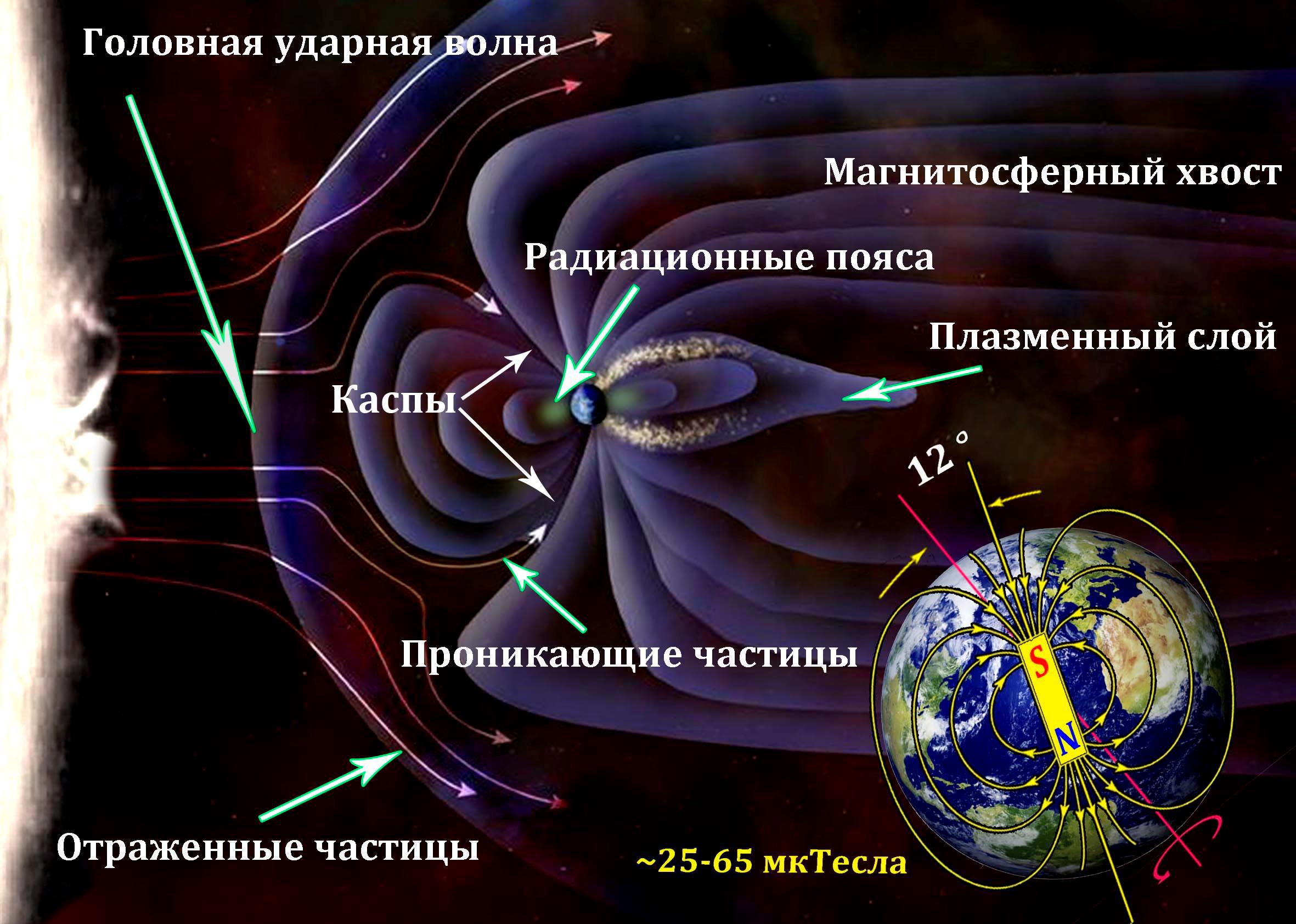 - Магнитное поле, направляющее заряженные частицы в определенную область планеты (не обязательно в полярную, — угол между магнитной осью и осью вращения планеты, может быть значительным.)