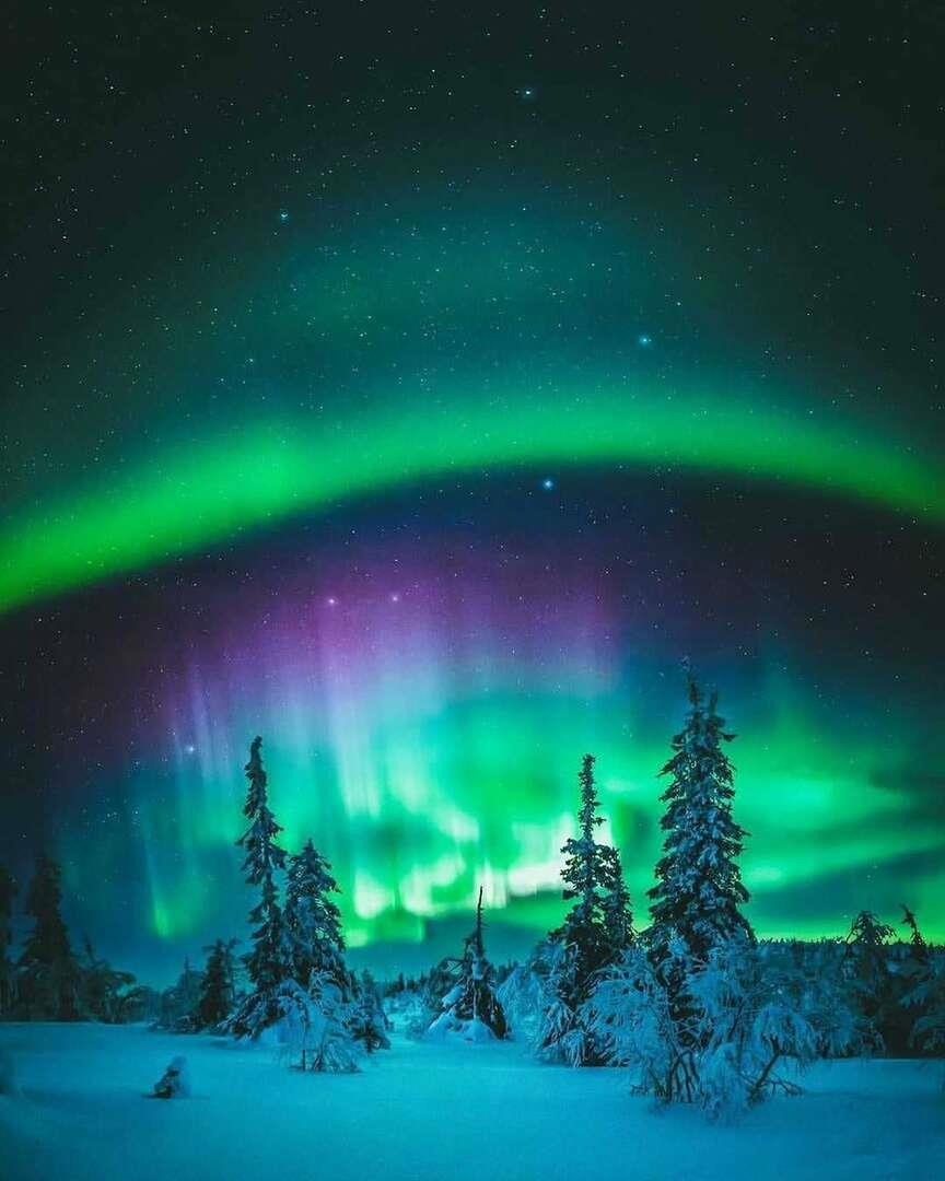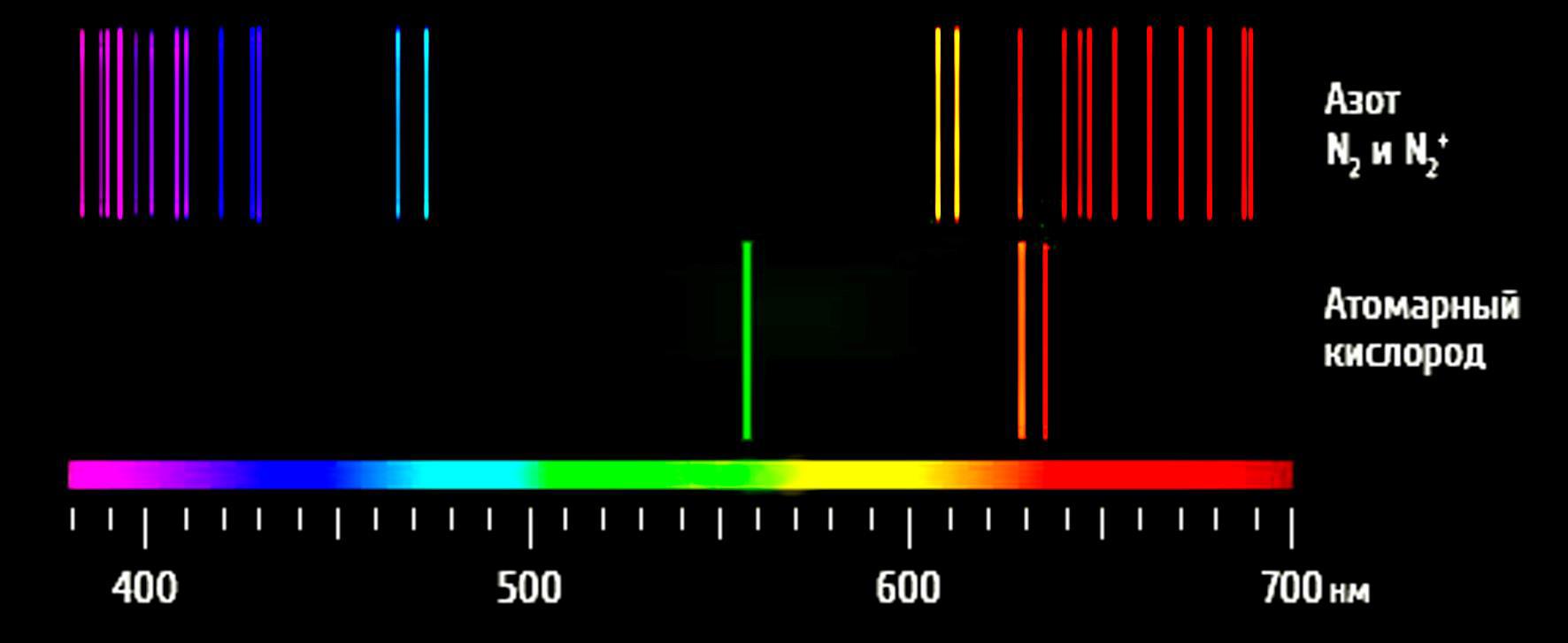 Это обуславливает цвет полярных сияний: например, за зеленый цвет отвечает кислород (его наиболее сильная линия), а за фиолетовый, синий или красный — азот. Вообще же, у каждого сияния своя неповторимая палитра цветов, зависящая от постоянно меняющегося процентного химического состава атмосферы.