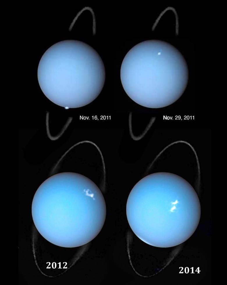 Полярные сияния Урана, пойманные УФ-спектрографом «Хаббла» в 2011, 2012 и 2014 годах.