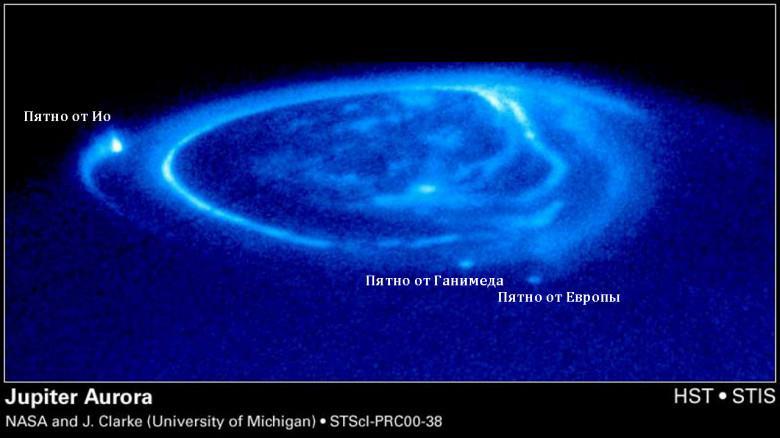 Авроральные или горячие пятна (в ультрафиолете) Ио, Ганимеда и Европы — следы магнитных силовых линий, соединяющих ионосферы спутников с ионосферой Юпитера.Яркие пятна внутри основных колец, появляющиеся время от времени, как считается, связаны с взаимодействием магнитосферы и солнечного ветра.