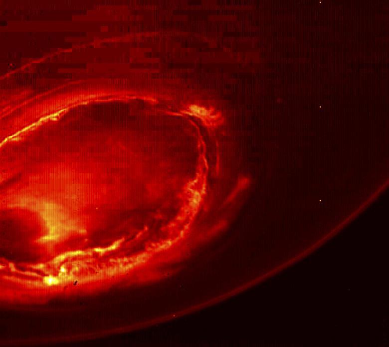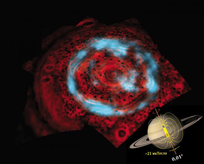 Северное полярное сияние Сатурна, снятое аппаратом «Кассини» в инфракрасном диапазоне (4 мкм, синим цветом). Лежащие внизу облака — окрашены в условный красный (5 мкм). Прямо под сияниями видно обнаруженное ранее шестиугольное облако