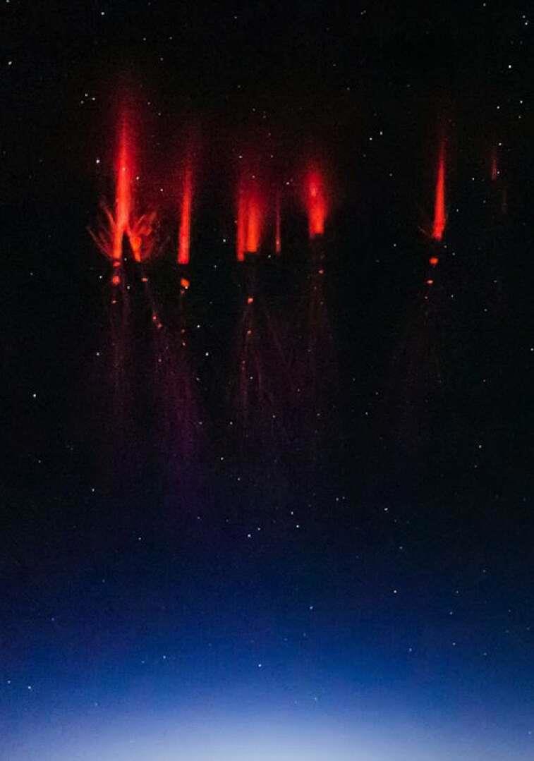Спрайты напоминают большую красную медузу с длинными синими щупальцами. Их сложно сфотографировать с земли, но есть много снимков, сделанных с самолетов.