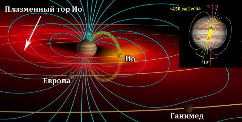Маленькая Ио играет важную роль в формировании магнитного поля гиганта Юпитера. — Ее вулканы выбрасывают в атмосферу массу ионизированных и нейтральных серы, кислорода, хлора, атомарного натрия и калия, молекулярного диоксида серы, а также пыли хлорида натрия. Все это вещество вытягивается магнитосферой Юпитера из тонкой атмосферы Ио со скоростью 1 тонна в секунду.