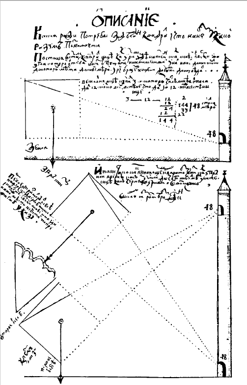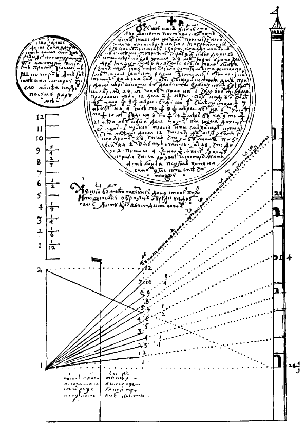 Но чтобы что-то размечать — нужно знать хотя бы основы геометрии. В 1697 году был переписан труд "Книга именуемая геометрия или землемерие радиксом и церкулем". Эта книга принадлежала дьяку Поместного приказа Андриан Григорьевич Ратманов (в Москве сохранились его палаты в Большой Козловском переулке). Некоторые историки считают, что список Ратманова был копией с более раннего списка, который имел ещё более ранний прототип. Книга посвящена изложению методов, с помощью которых могли осуществляться измерения на местности. Она состоит из серии задач, которые возникали, в том числе, и перед строителями городов. Вот пара листов из этой книги.