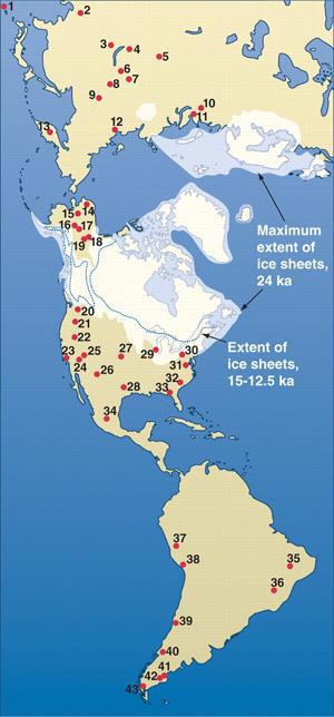 Белым цветом обозначен ледниковый щит в период наибольшего распространения 24 тыс. лет назад, пунктирной линией обведен край ледника в период потепления 15–12, 5 тыс. лет назад, когда открылись два «коридора» с Аляски на юг. Красными точками показаны места важнейших археологических находок, в том числе упомянутые в заметке: 12 — стоянка в низовьях Яны (32 тыс. лет); 19 — кости мамонта с возможными следами обработки (28 тыс. лет); 20 — Кенневик; 28 — самая большая «мастерская» культуры Кловис в Техасе (650 000 артефактов); 29 — древнейшие находки в штате Висконсин (14, 2–14, 8 тыс. лет); 39 — южноамериканская стоянка с костями лошади (13, 1 тыс. лет); 40 — Монте-Верде (14, 6 тыс. лет); 41, 43 — здесь найдены «рыбообразные» наконечники, возраст которых (12, 9–13, 1 тыс. лет) совпадает со временем существования культуры Кловис. Рис. из обсуждаемой статьи в Science