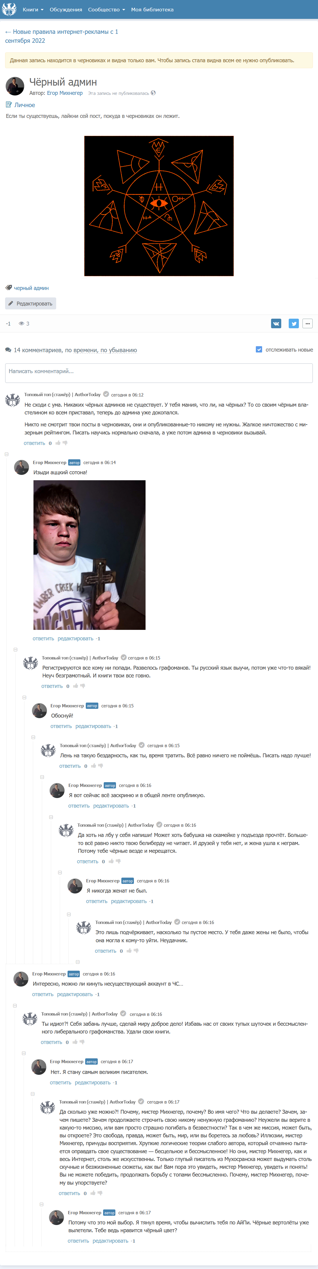 Я решил разобраться в чём дело и провести ритуал вызова чёрного админа. Прочитав скачанный на торренте гримуар, тысячи лет скрывавший от широкой общественности главные тайны мироздания, я начертил в неопубликованном посте пиктограмму и стал терпеливо ждать.