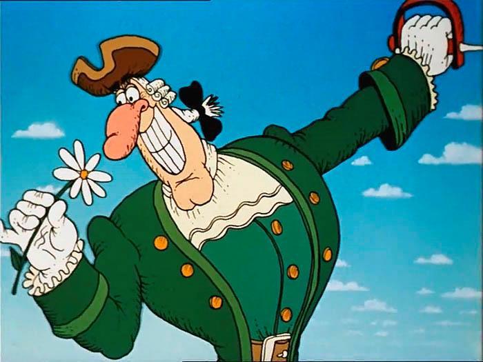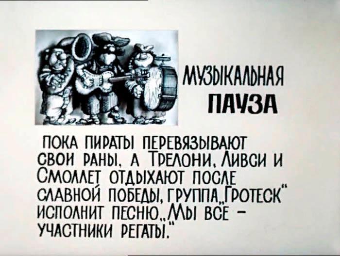 И действительно в таком виде сцена и вошла в мультфильм. Из приколов могу вспомнить, что фраза из песни, которую я пел: «Здесь, что не страница – мрачные все лица, луидоров и пиастров звон», звучала сначала иначе: «Здесь что не страница – вор или убийца, свадеб нет, но много похорон». А скрытый смысл был в том, что наши генсеки тогда, в связи с их преклонным возрастом, умирали один за другим: Брежнев, Андропов, Черненко. Потом, конечно, убрали эти слова.»