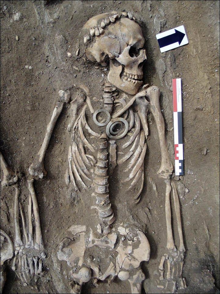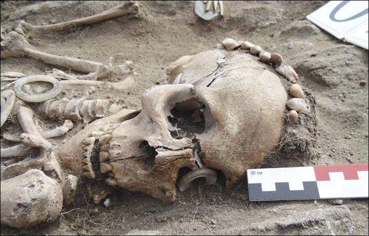 Пока археологи осторожно относят эту пару к представителям глазковской культуры, которые проживали в этих метах 4,3-4,8 тыс. лет тому назад. Однако образцы уже отправили в одну из самых продвинутых лабораторий мира, в Канаду. Возможно, датировка изменится. Но хотя это всё и интересно, но не главное всё же. Всего четыре странных предмета задали один, но очень серьёзный вопрос. Вот посмотрите на фото скелета мужчины близко: