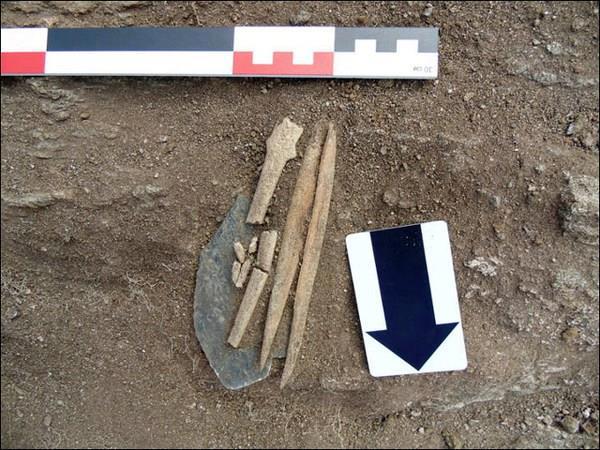 Скелет мужчины сохранился полностью и хорошо. Скелет женщины погрызла какая-то живность и его верхняя часть, по сути, утрачена. Но зато полностью сохранился скелет мужчины и все «свидетельства материальной культуры». У мужика на голове и на ногах сохранились зубы оленя, которые по всей видимости украшали его шапку и сапоги. Между ног, в районе колен у него лежал мешочек с металлическими и костяными инструментами, назначение которых археологи определить пока не смогли. Около женщины обнаружили нефритовый нож длиной 13 см и шириной 7 см (!). Фото странного ножа не нашёл, а инструменты мужика, вот они: