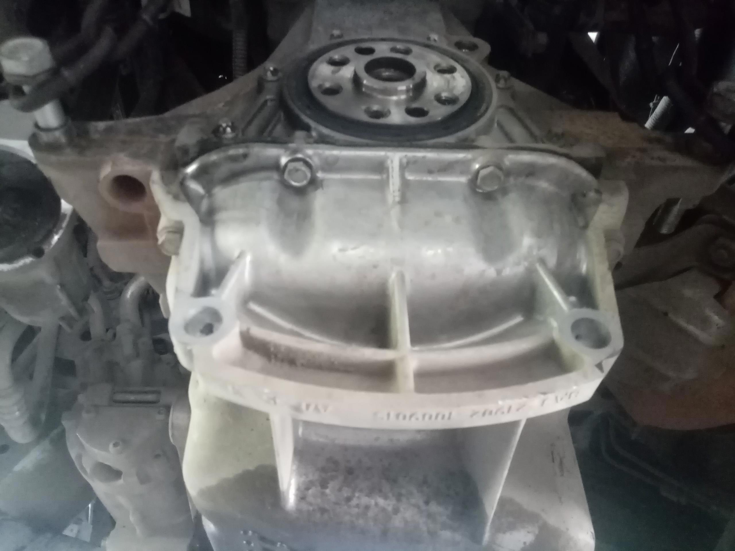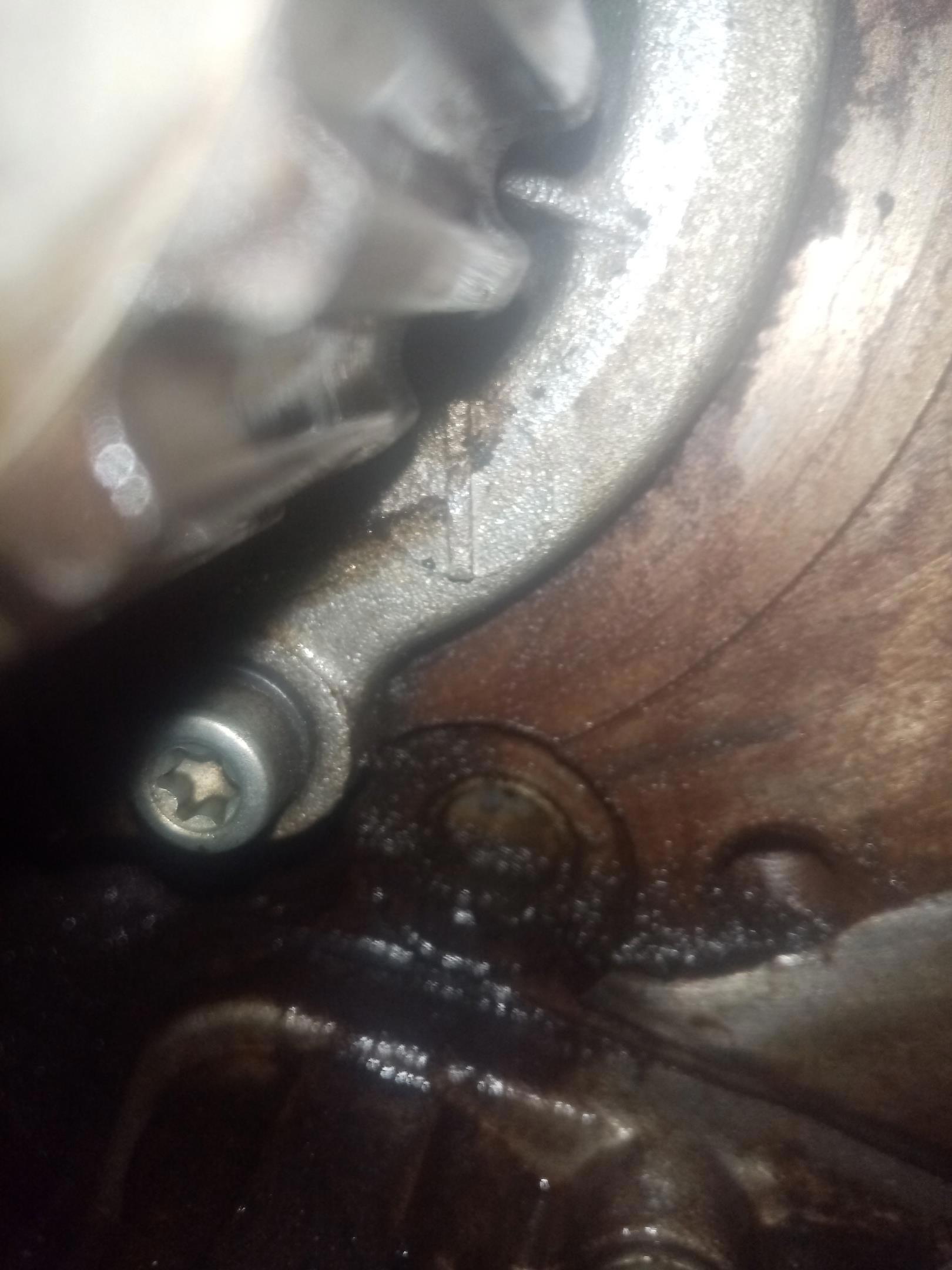 Справа от болта со звездочкой искомая заглушка. На вид - да, течь от неё. Но постойте... Что это там чуть ниже?.. А ниже - вылезшая прокладка маслонасоса. Тут-то и закралось нехорошее подозрение, что придётся менять эту прокладку. Чтобы точно подтвердить диагноз, накинули ГРМ и запустили двигатель. И таки да, текла прокладка. Всё фигня, но чтобы снять маслонасос - надо снять маслянный поддон двигателя. А чтобы снять поддон - надо снять коробку передачь.