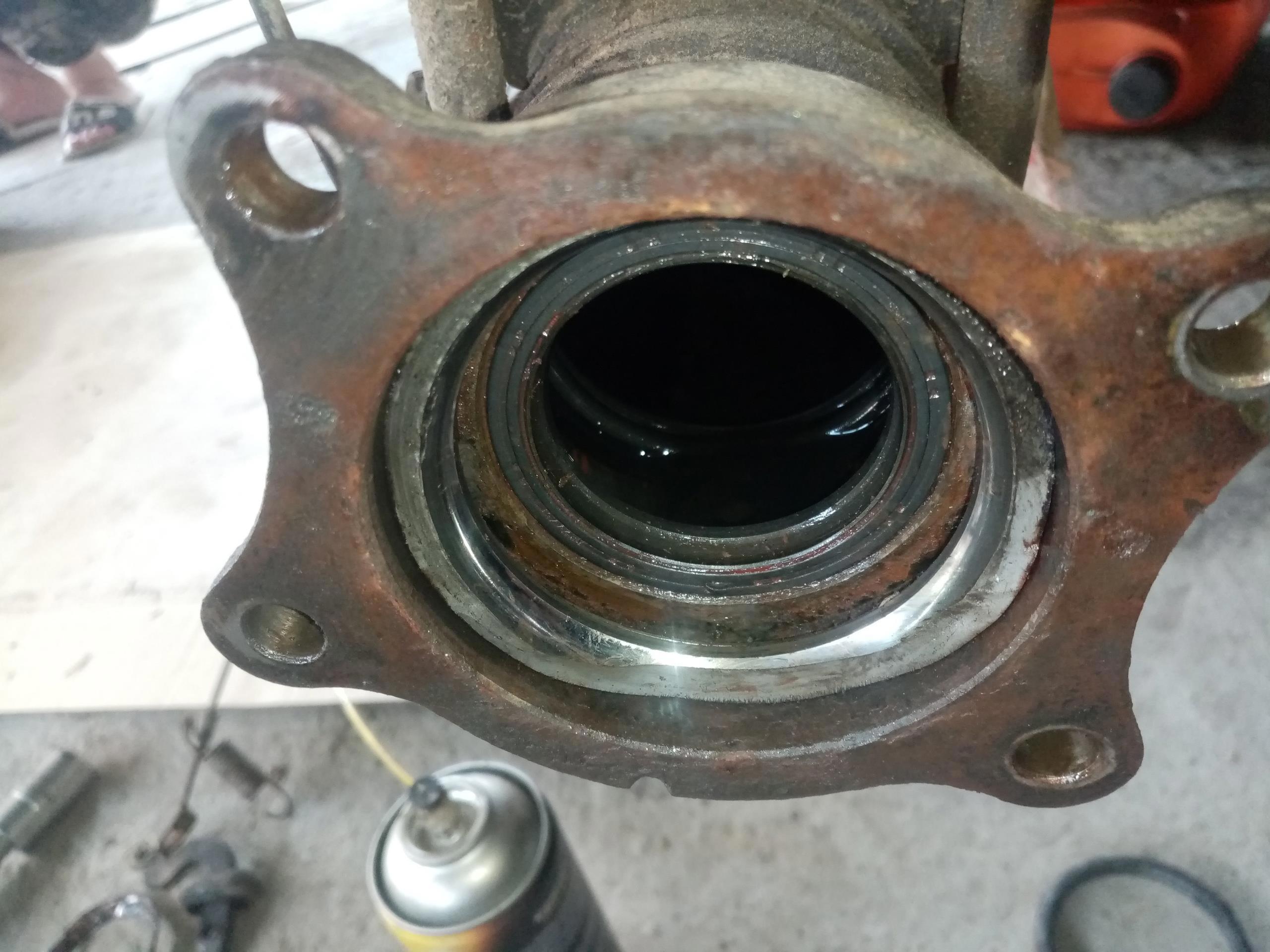 На фото справа черная часть - это старая трещина. Выковырять остаток обоймы оказалось делом сложным, но решаемым. Куда интереснее было то, что новой запорной втулки подшипника небыло. Ребят проездом, и ждать 5 дней пока она придёт не могли. Пришлось греть и сбивать старую. Грели ее в две горелки, потом сунули другой конец полуоси в ведро, и сбили втулку. Сборка в обраном порядке прошла без проблем и приключений.