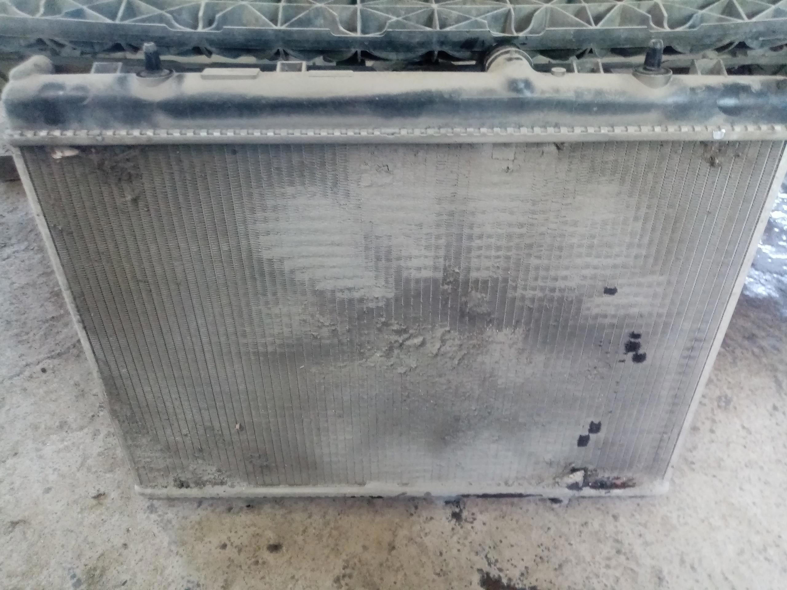 Сам виновник торжества. Там, где пыли нет - не продувается насквозь, так как закрыто кожухом вентилятора. Данный Ситроен снабжен турбированным мотором БМВ объёмом 1.6 литра, а это значит что теплонагруженность у него выше, хотя сам радиатор как на атмосферном автомобиле, что и без того ухудшает и так невеликий теплоотвод. К примеру, на Ниссан Скайлайн, как у меня, в атмосферном варианте установлен радиатор толщиной 18 миллиметров, турбированный мотор комплектуется радиатором толщиной 25 миллиметров, что значительно улучшает рассеивание теплоты. Но, БМВ на это наплевать, Ситроену тем более. Проблемы покупателей производителей не волнуют.