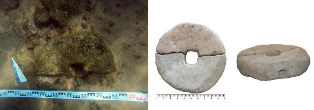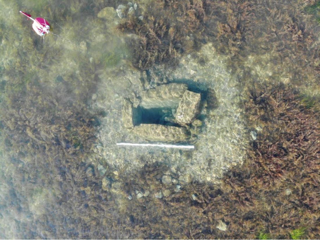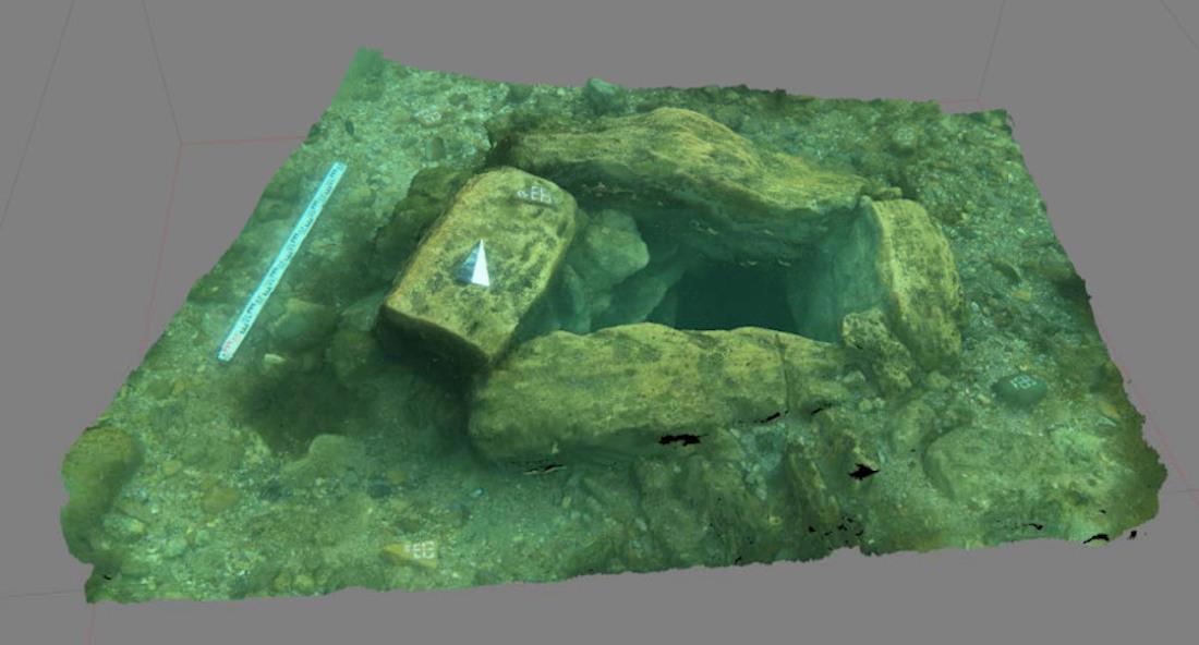 Вот так выглядит обнаруженный под водой каменный ящик неустановленного назначения, а ниже – его 3D модель, воссозданная с помощью фотограмметрии.Помимо подводных работ, ведутся наземные, поскольку в прибрежной полосе обнаружены домовладения римского периода; застройка прослеживается в виде каменных цоколей сырцовых стен.