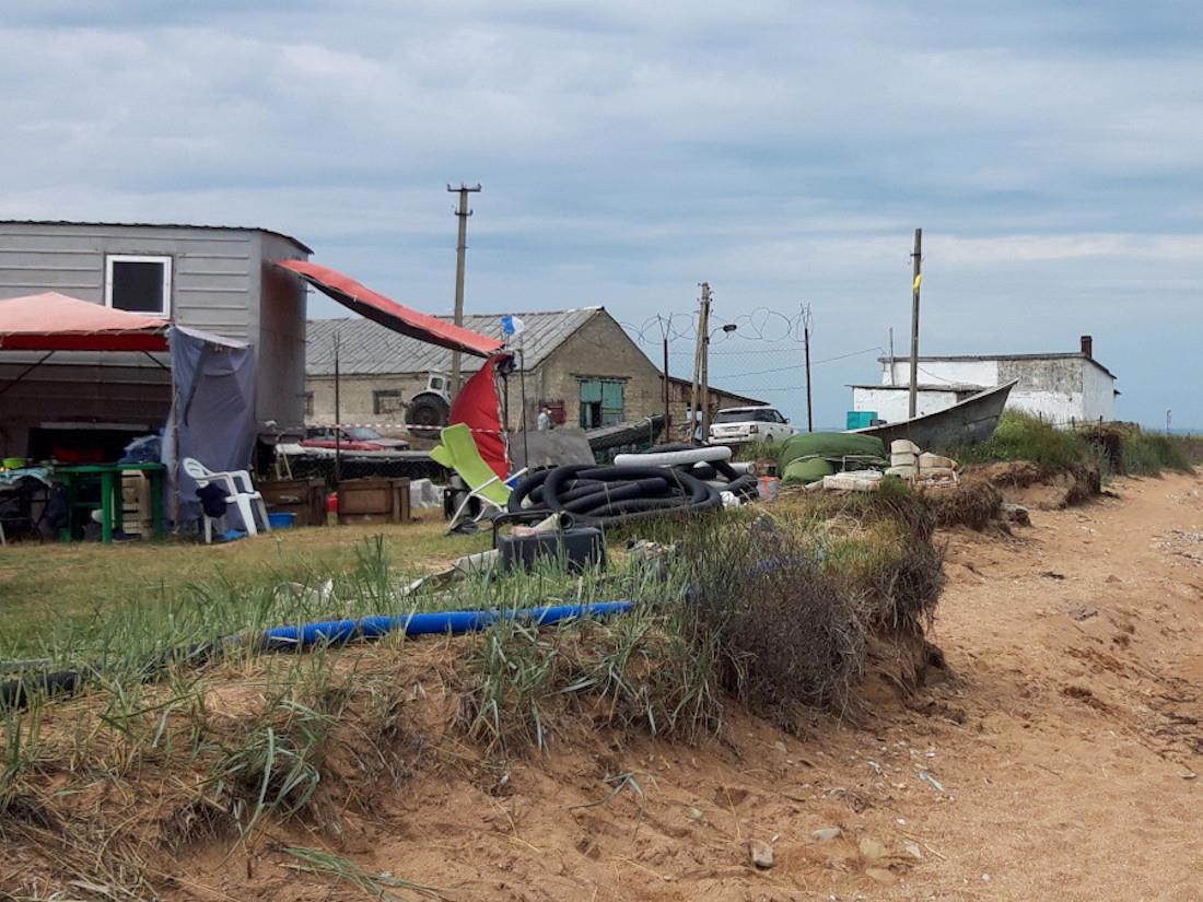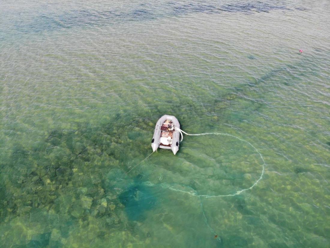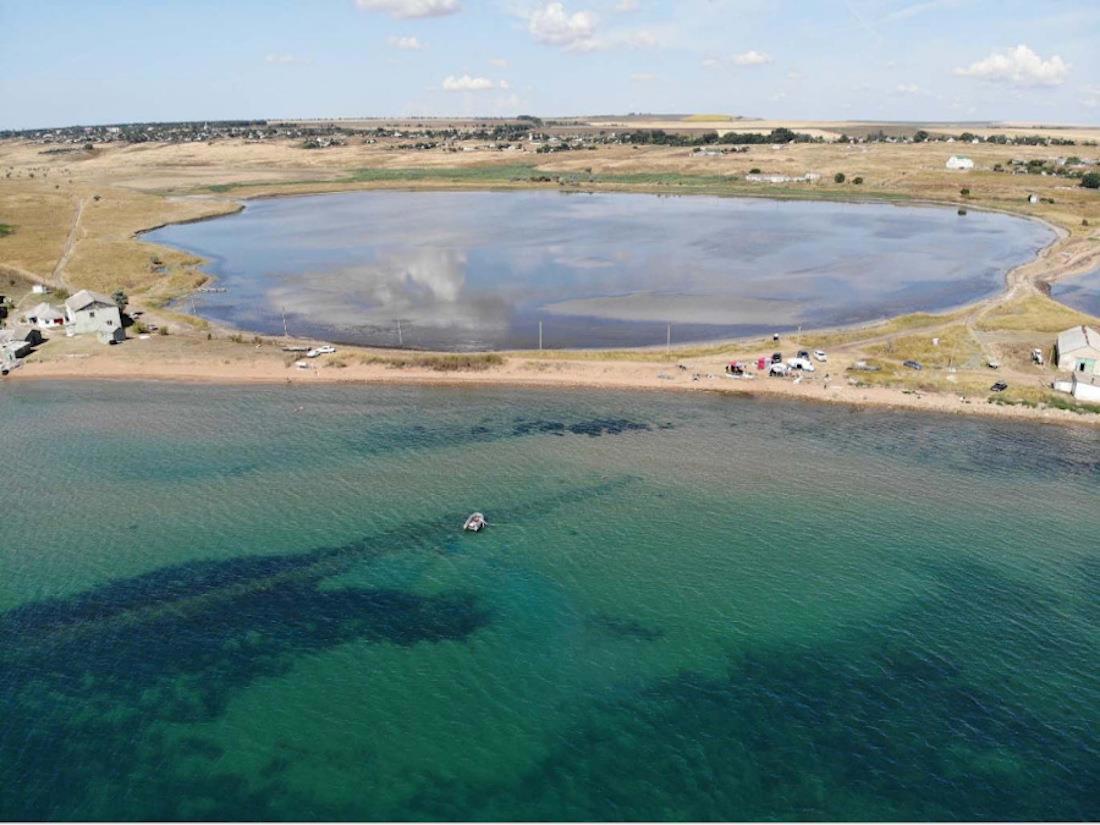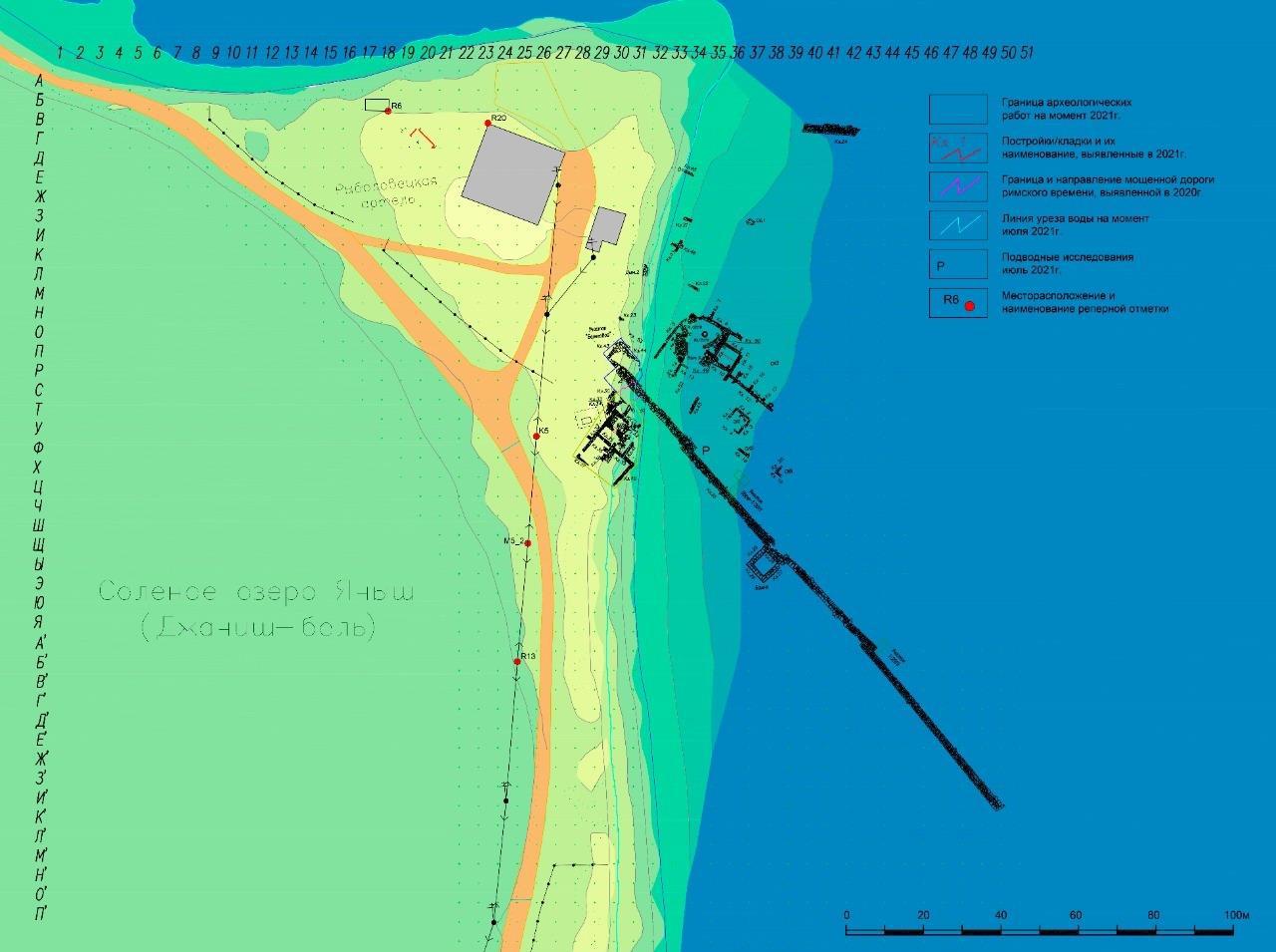 На аэрофотоснимке хорошо видны озеро Яныш, песчаная коса и часть затопленной Акры с упомянутой стеной. Справа виден даже временный лагерь археологов – с красными палаточками.