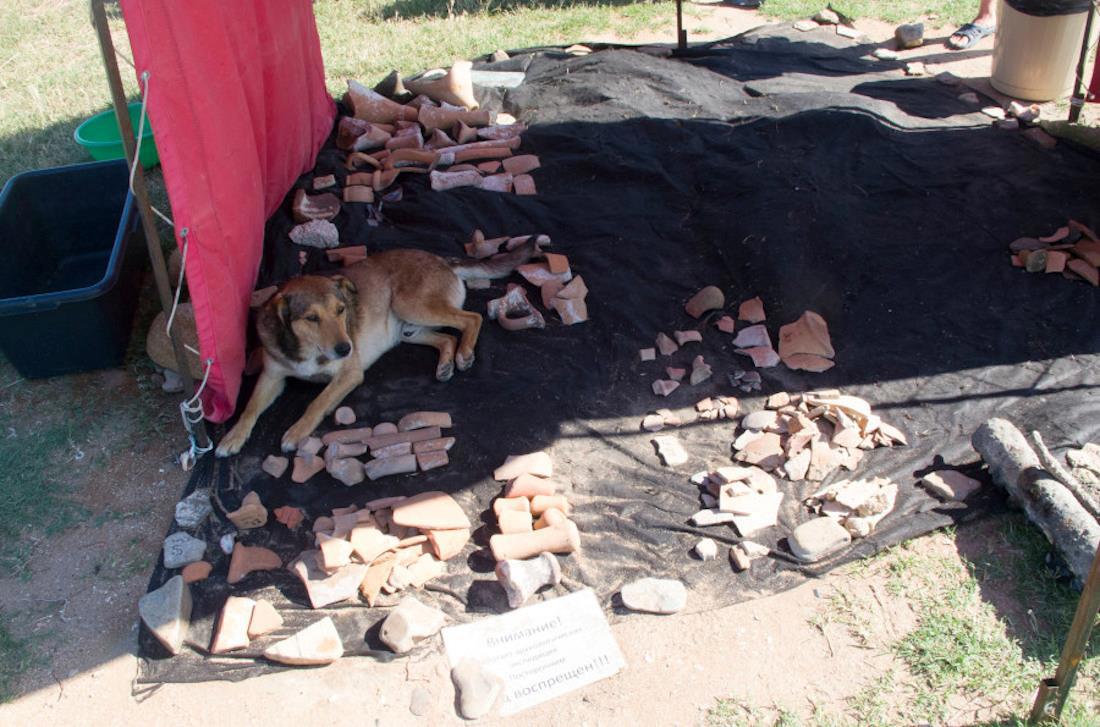 И наземные и подводные находки складируются в святом месте – камералке или керамичке – где чистятся, сортируются, зарисовываются. У нашей керамички было два приходящих с рыбхозяйства стража, нёсших дозор не за страх, а за небольшую вкусняшку. Бартик, старенький и рыжеватый, старожил, приходит к лагерю чуть ли не десять лет, а у Боцмана, лопоухого и ласкового, это первый археологический сезон ))