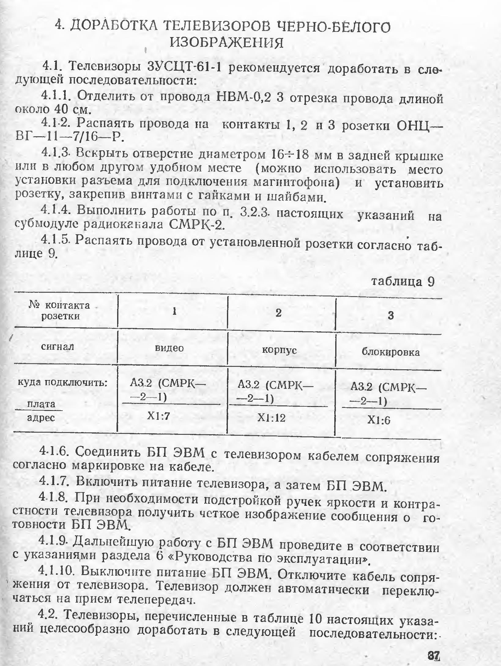 Но это всё лирика. Суровая проза жизни только началась - теперь её предстоит подключить к телевизору. Казалось бы, чего проще - взял провод, тюльпан или скарт, в крайнем случае спаял бы сам. А вот и нет! Во-первых, для подключения к телевизору на ЭВМ есть разъём с семью контактами. Во-вторых, в комплекте идёт провод с чёрной коробочкой - тоже с семью контактами. Изучение вопроса более детально позволило выяснить, что коробочка должна питаться 12 вольтами, которые берутся из телевизора. В книжке к ЭВМ вопрос подключения к телевизору рассматривается страницах на 10-15, со схемами и пр. Что-то типа такого: