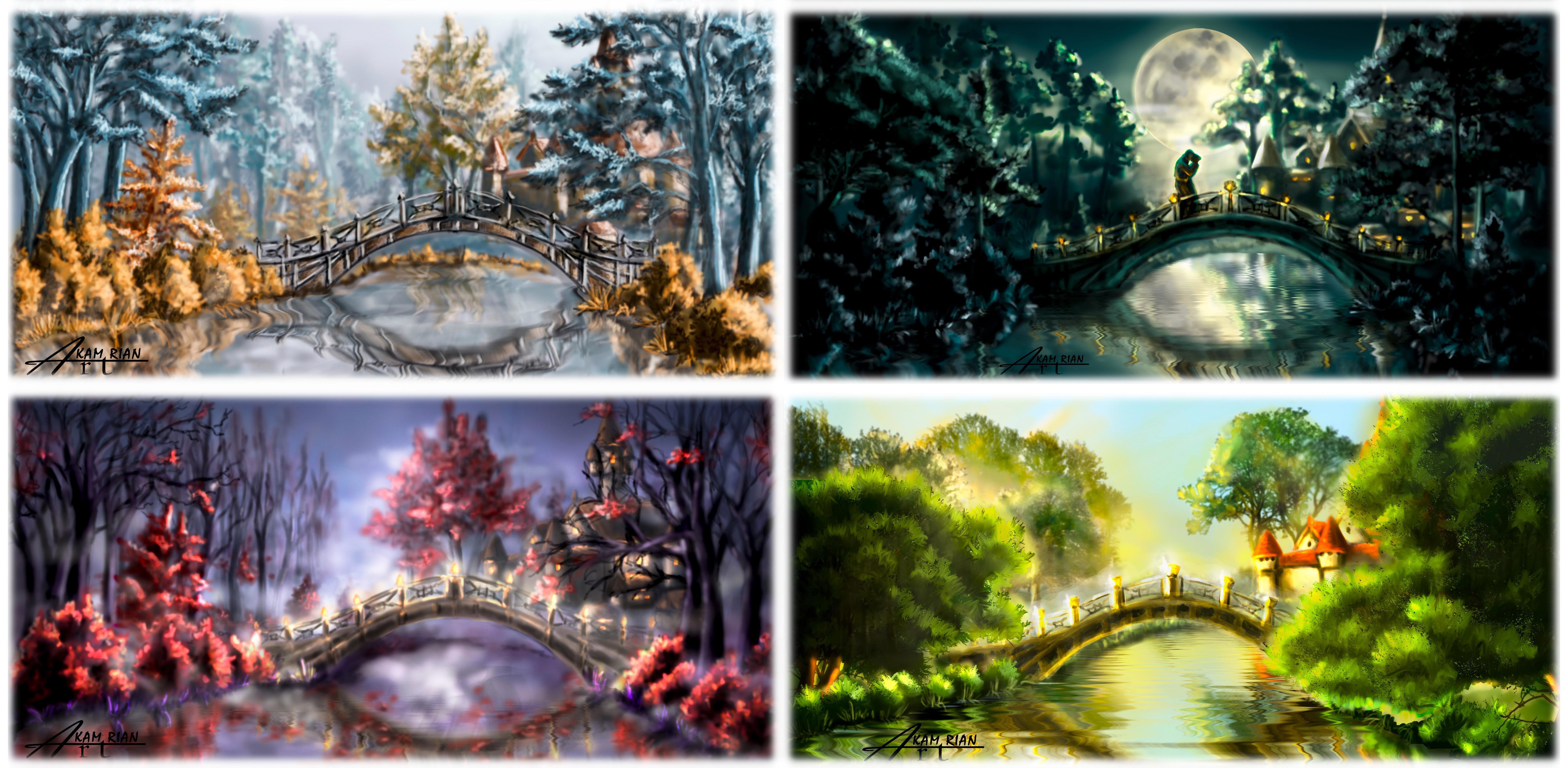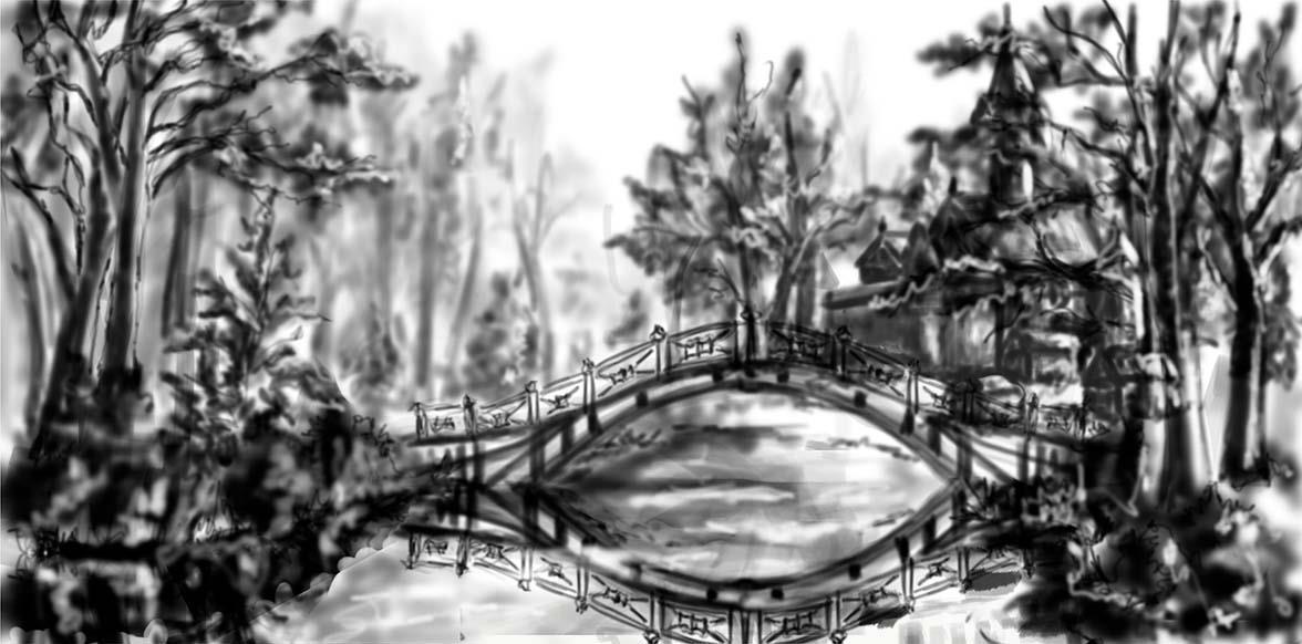 Автор: Бутузова ИринаРешила улучшить свои навыки рисования, и нарисовала набросок пейзажа с мостиком, который дальше хочу сделать в шести различных цветовых схемах и настроениях.