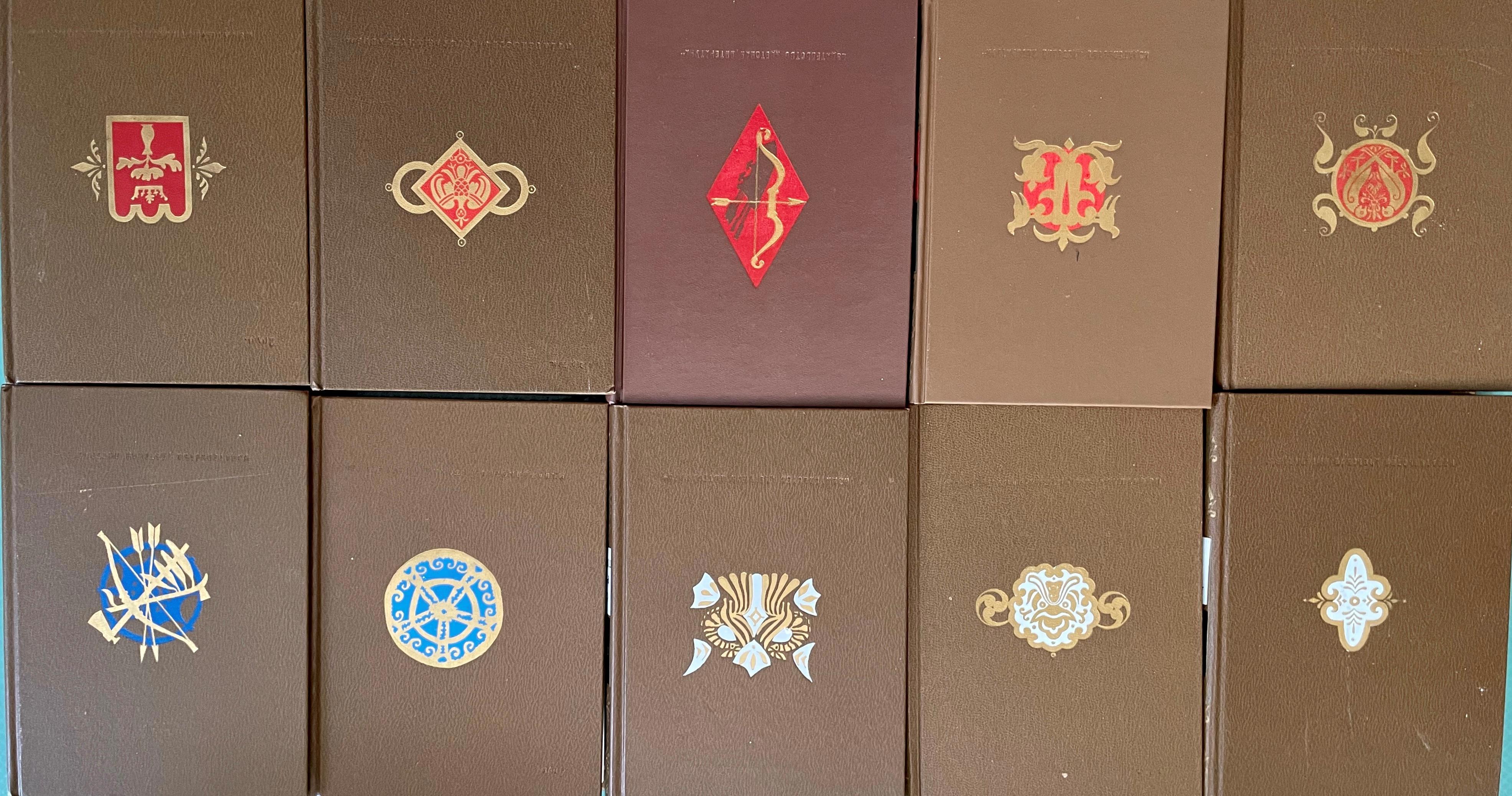 Может показаться, что на книгах одинаковый узор, но это не так. Если рассмотреть поближе, то можно увидеть различия. Узоры стилистически подобраны в связи с особенностями входящих в книгу текстов.