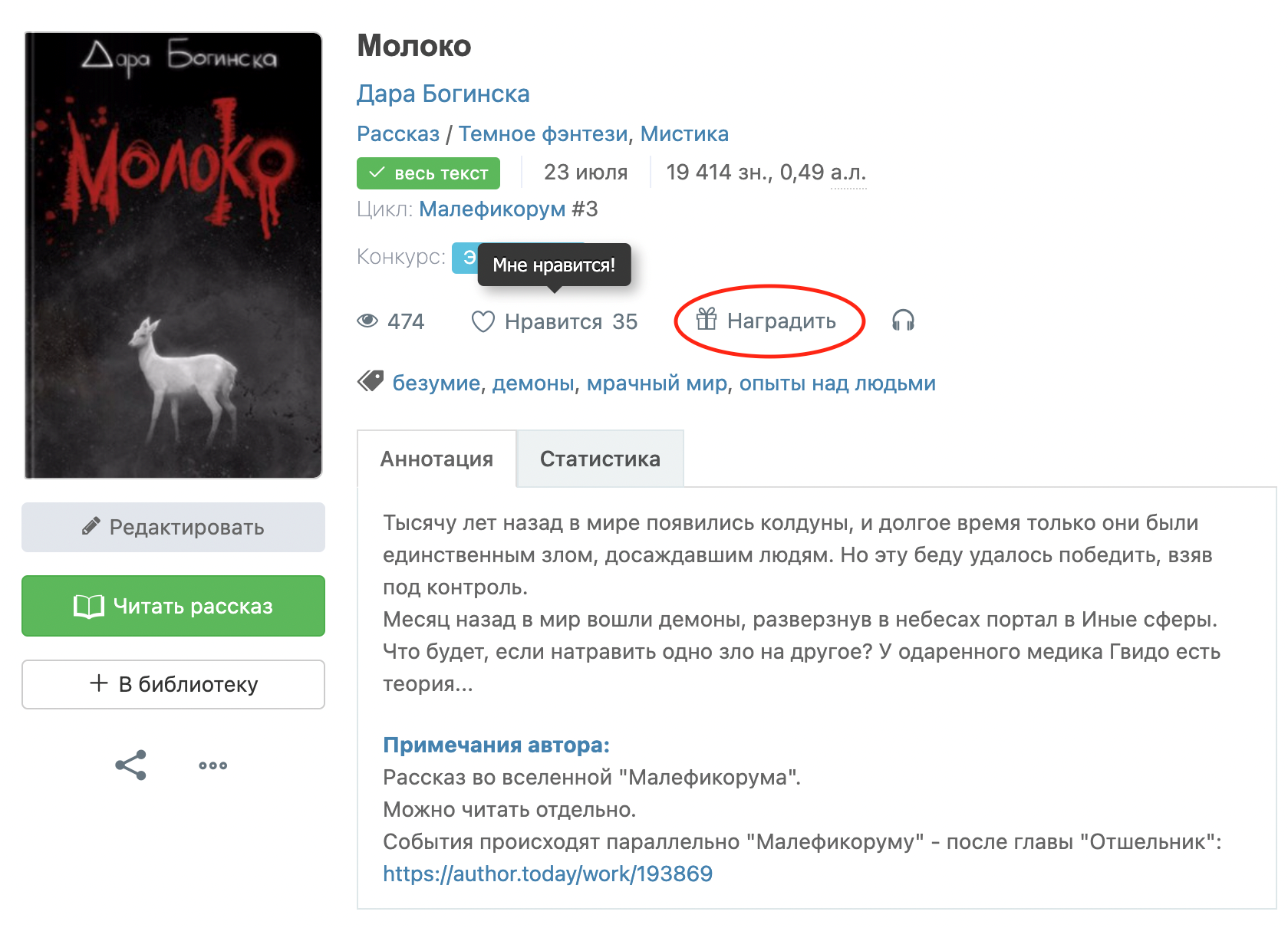 Наконец подключила себе награды к произведениям. Волшебная кнопочка располагается рядом с "Нравится" и сильно-сильно меня радует. Буду очень благодарна за возможность купить себе кружку кофе с писательства. :)