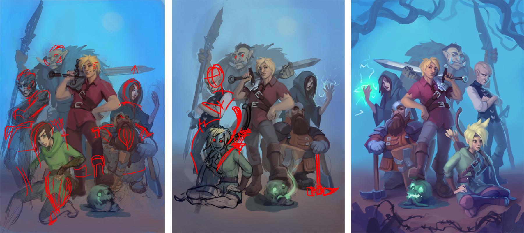 Суть картинки проста: она и подражает, и пародирует типичные пафосные обложки фэнтези-книжек, где команда ярких персонажей выпендрёжно позирует перед читателем. После неспешной разработки с множеством правок, в ходе которых мы отзеркалили композицию, Саша отдала картинку мне на дальнейшее поругание.